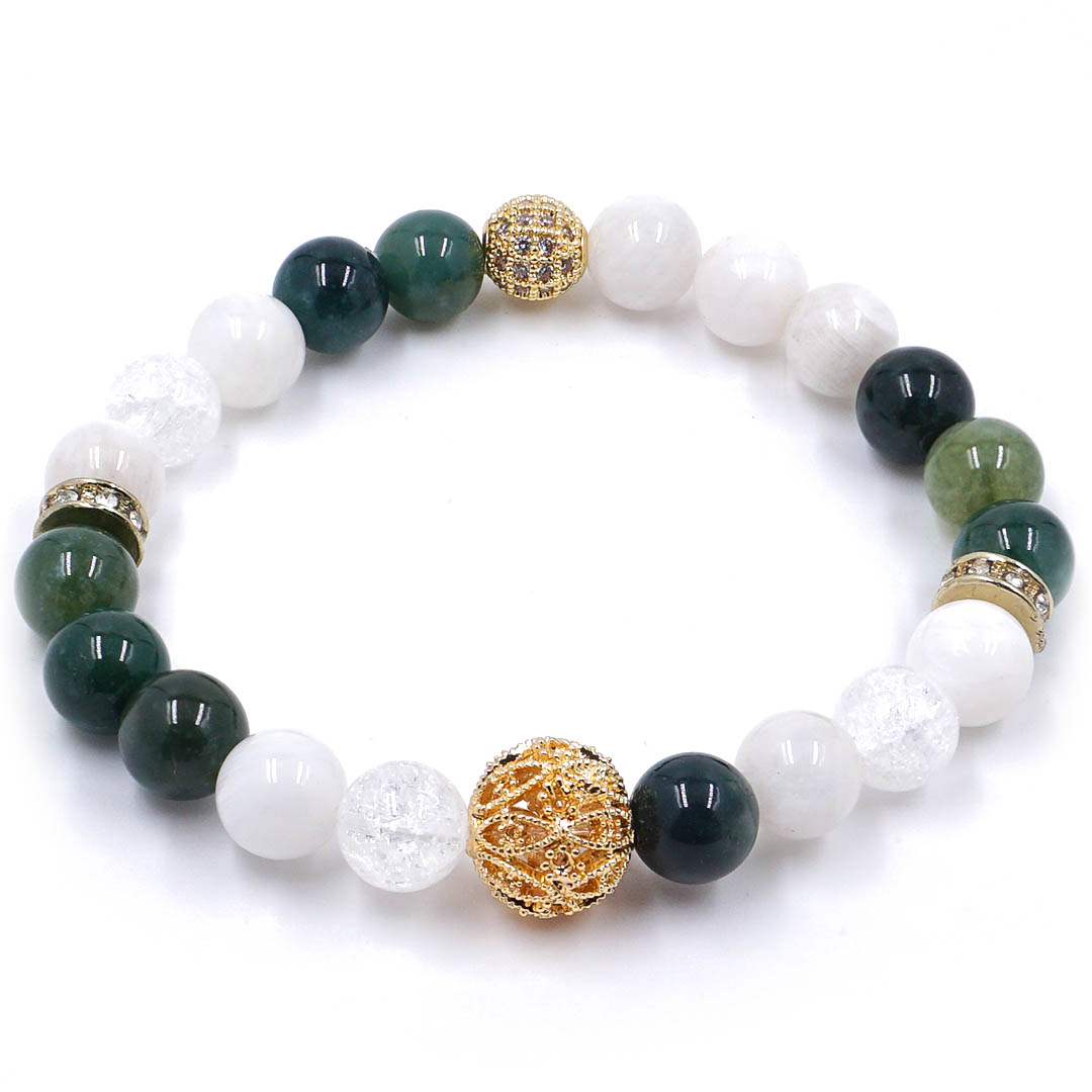 Erdei harmónia egy karkötőben. Ez a különleges karkötő olyan, mintha egy erdei sétán lennél – friss, tiszta és földelő erejű. A moha achát mély, zöld színei a természet közelségét idézik, miközben segítenek megtalálni a belső egyensúlyt és nyugalmat. Képzeld el, ahogy a fák között sétálsz, és a természet ereje áramlik beléd. A roppantott hegyikristály még tisztábbá és erősebbé teszi ezt az érzést, miközben segít eltávolítani a negatív energiákat és megteremti a harmóniát körülötted. A tejkvarc finom, nyugtató hatása pedig szelíden oldja a feszültséget, így minden napot friss energiával indíthatsz. Ez a karkötő egy igazi erdei kincs, amely segít, hogy bármikor rátalálj a belső békédre és a stabilitásra. Gyöngyszemek mérete kb 7-8 mm