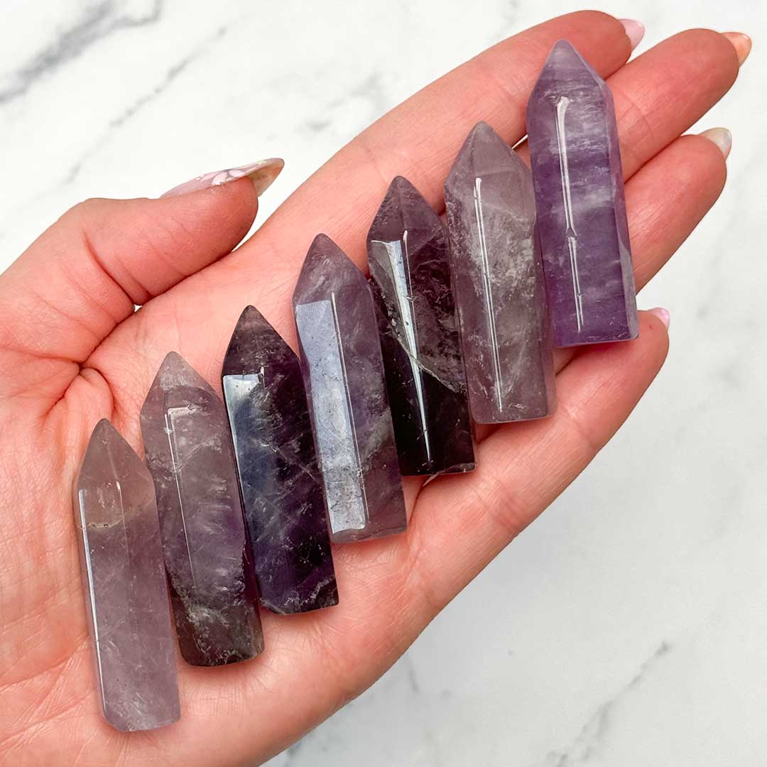 Gyönyörű kis ametiszt csúcsok, melyek között levendulaszín és egészen sötét lila darabok is megtalálhatóak.