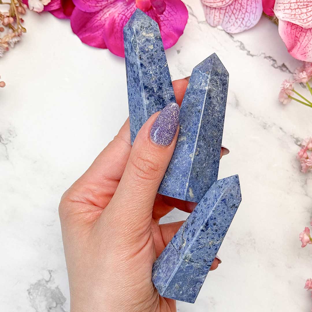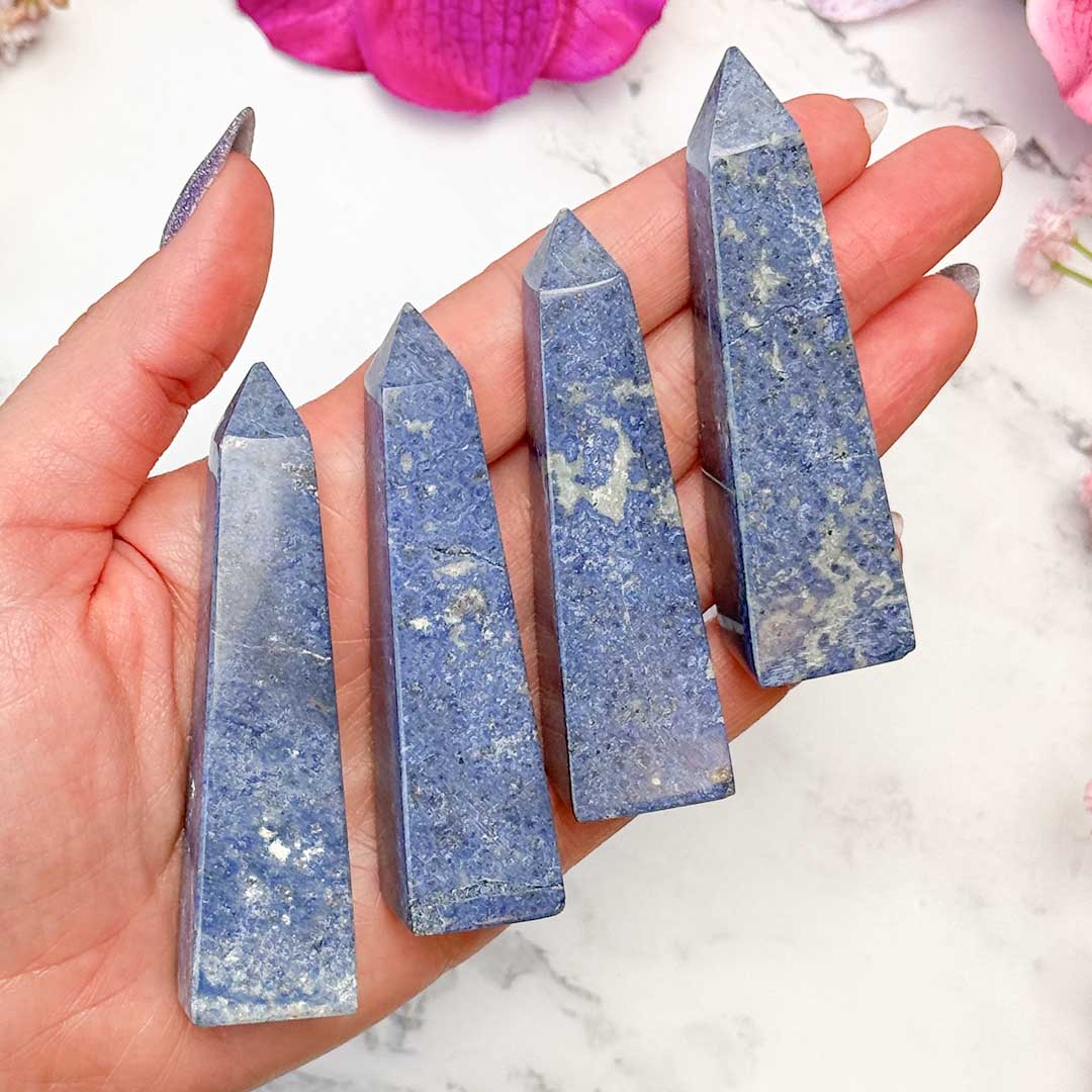 Ezek a szépséges Dumortierit tornyok Peruból érkeztek, nagyon ritka alumínium-borát-szilikát ásványok, melyek különlegesen szép, kékes árnyalatáról ismertek. A dumortierit tökéletes ásvány az önállóságunk és intuíciónk fejlesztésére, képes megnyitni harmadik szem csakránkat.