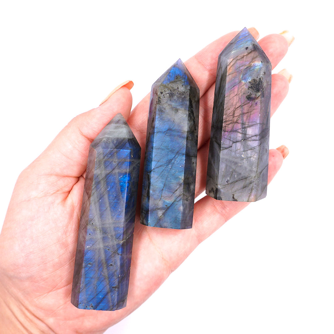 Gyönyörű, irizáló Labradorit csúcsok, mindegyik darabon minimum egy oldalán látható a flash!