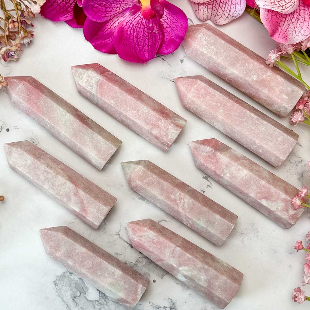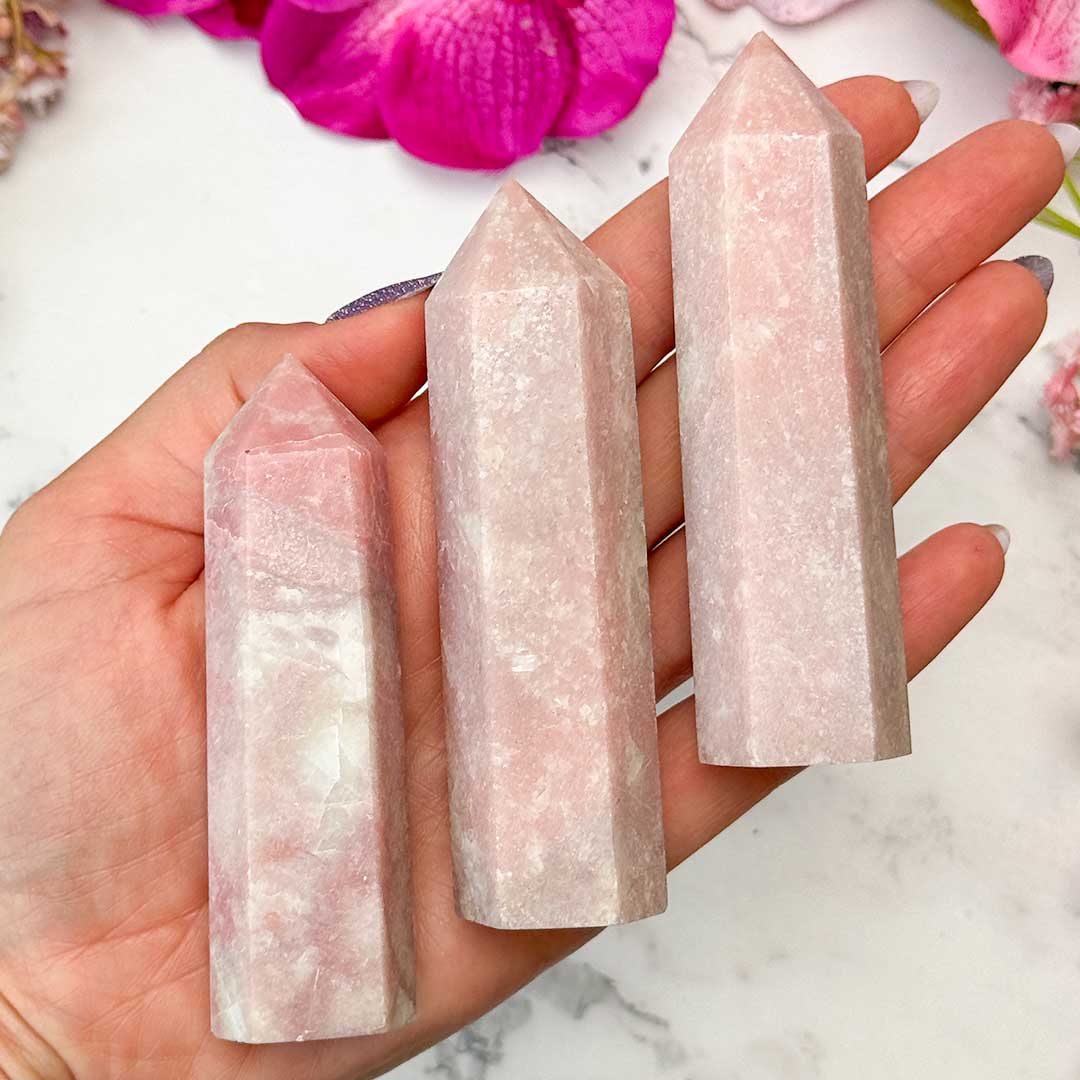 Pasztellrózsaszín Pink opál tornyok nagyobb méretben, nagyon érdekes tapintású és kellemes színű darabok!