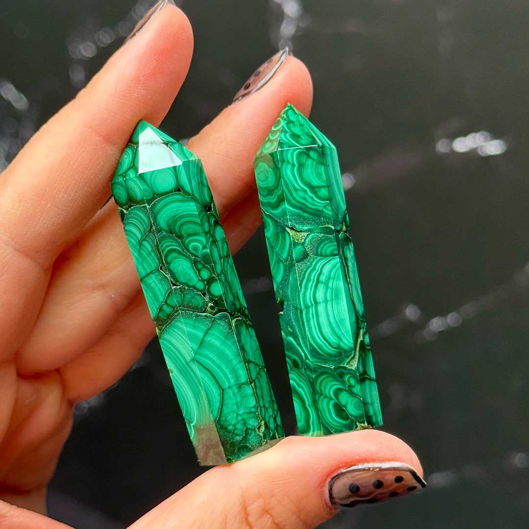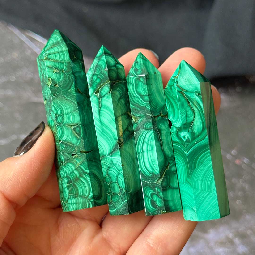 Prémium minőségű Malachit tornyok! Magasfényűre, tökéletesre polírozott gazdag mintázatú Malachitok, rajzolatokkal, szemekkel és áramlásokkal, gyönyörű darabok!