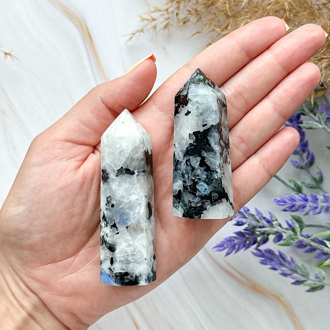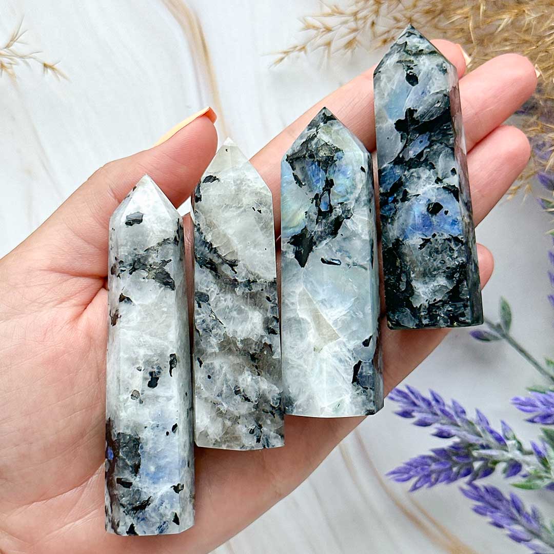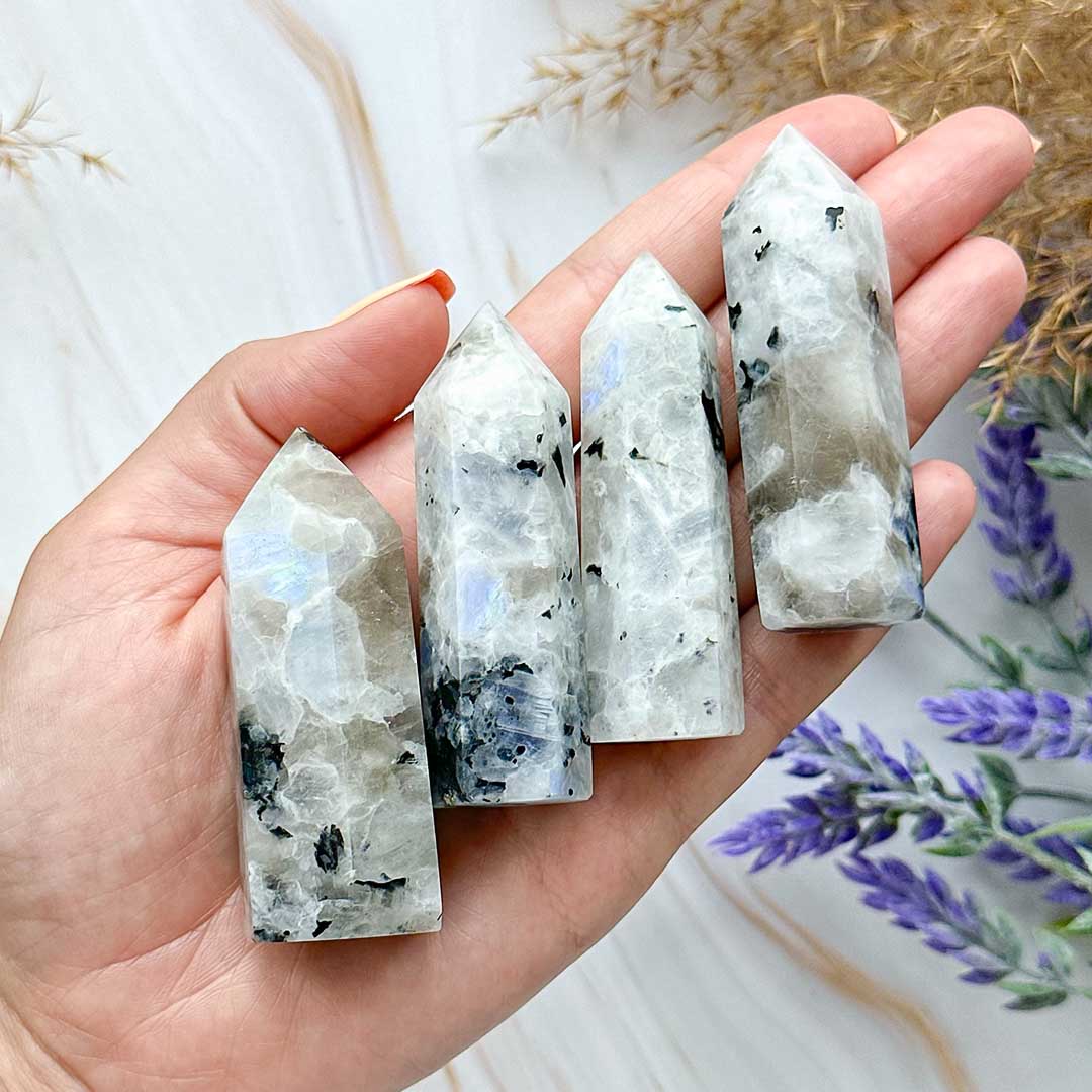 Minden darabon minimum 2-3 foltban látható kis kékes szivárvány-holdkő fény.
