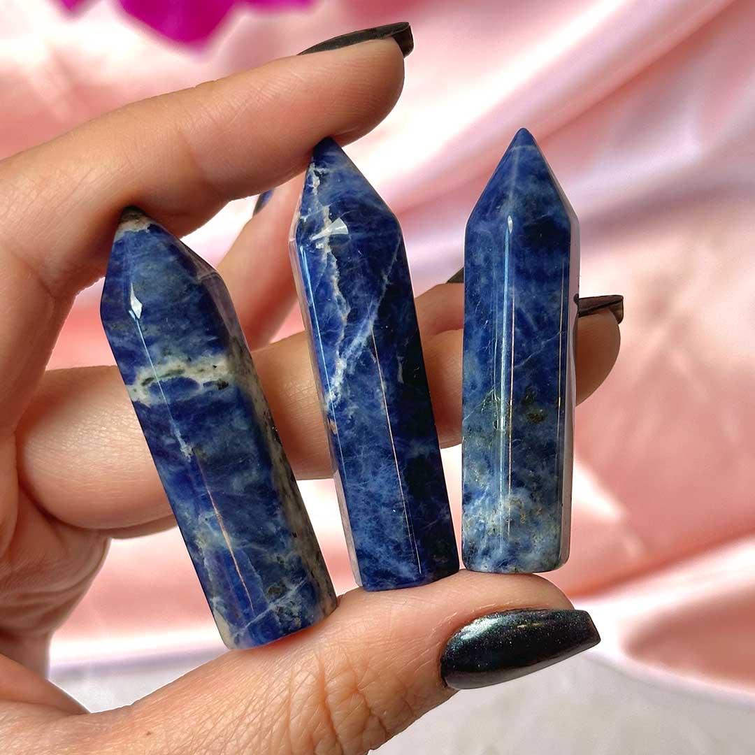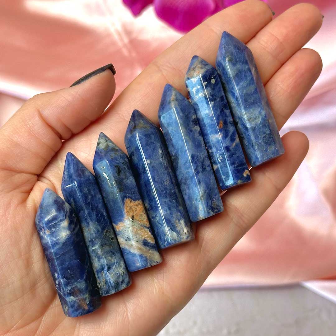 Kellemes, felhősen mintázott kéklő Szodalit csúcsok, mini tornyok.