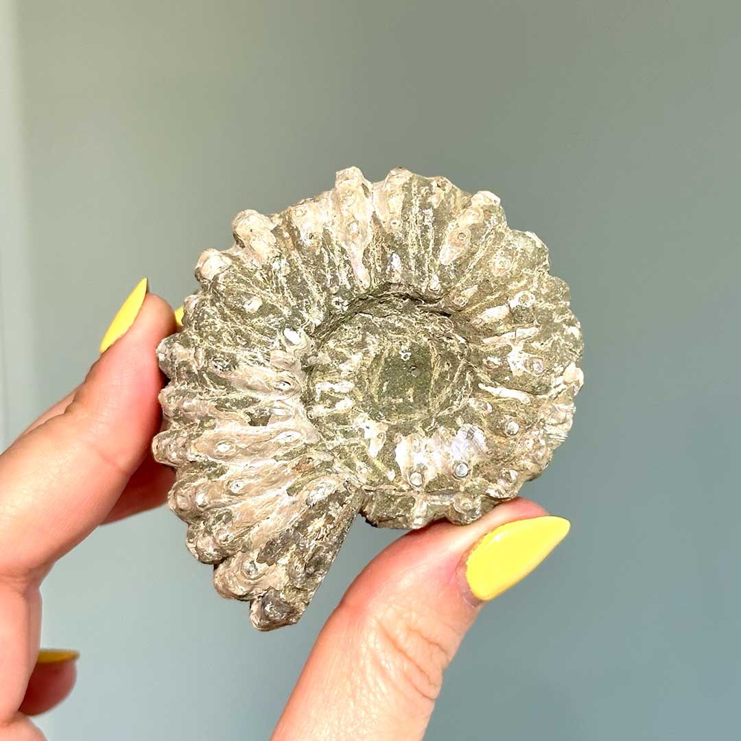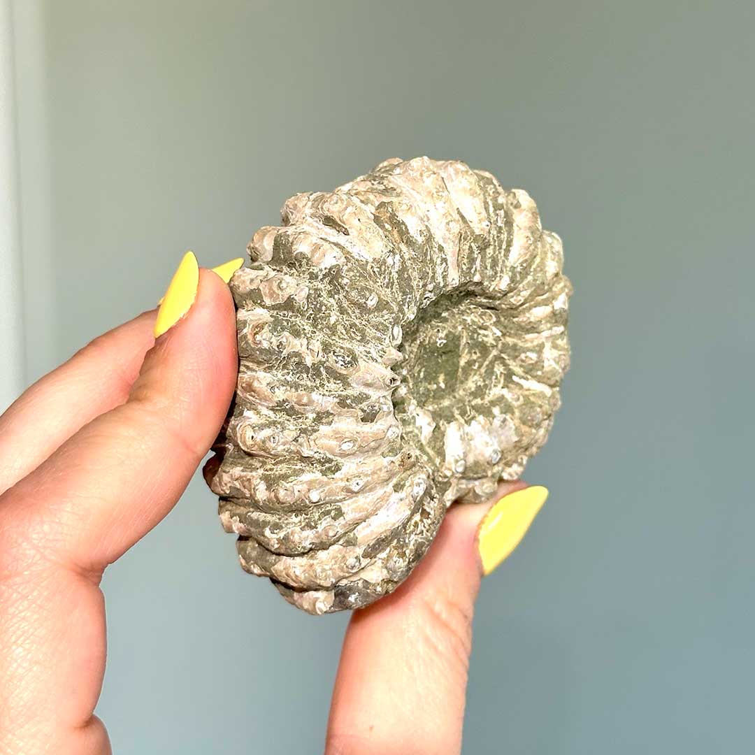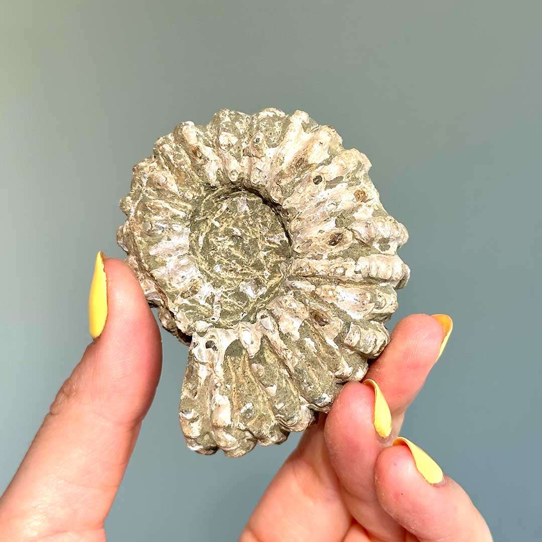 Gyönyörűen megőrzött ammonitesz fosszília, részben csiszolva, hogy megmutassa a fosszília jellegzetességeit. A Madagaszkár ősi partjairól származó kövületek, melyek nem csak bepillantást nyújtanak a Föld múltjába, de szépségükkel is gyönyörködtetnek: a kamrák mintázata, illetve kék minták figyelhetőek meg a héjon. (Ez a darab a Douvilleiceras nemzetségbe tartozik)