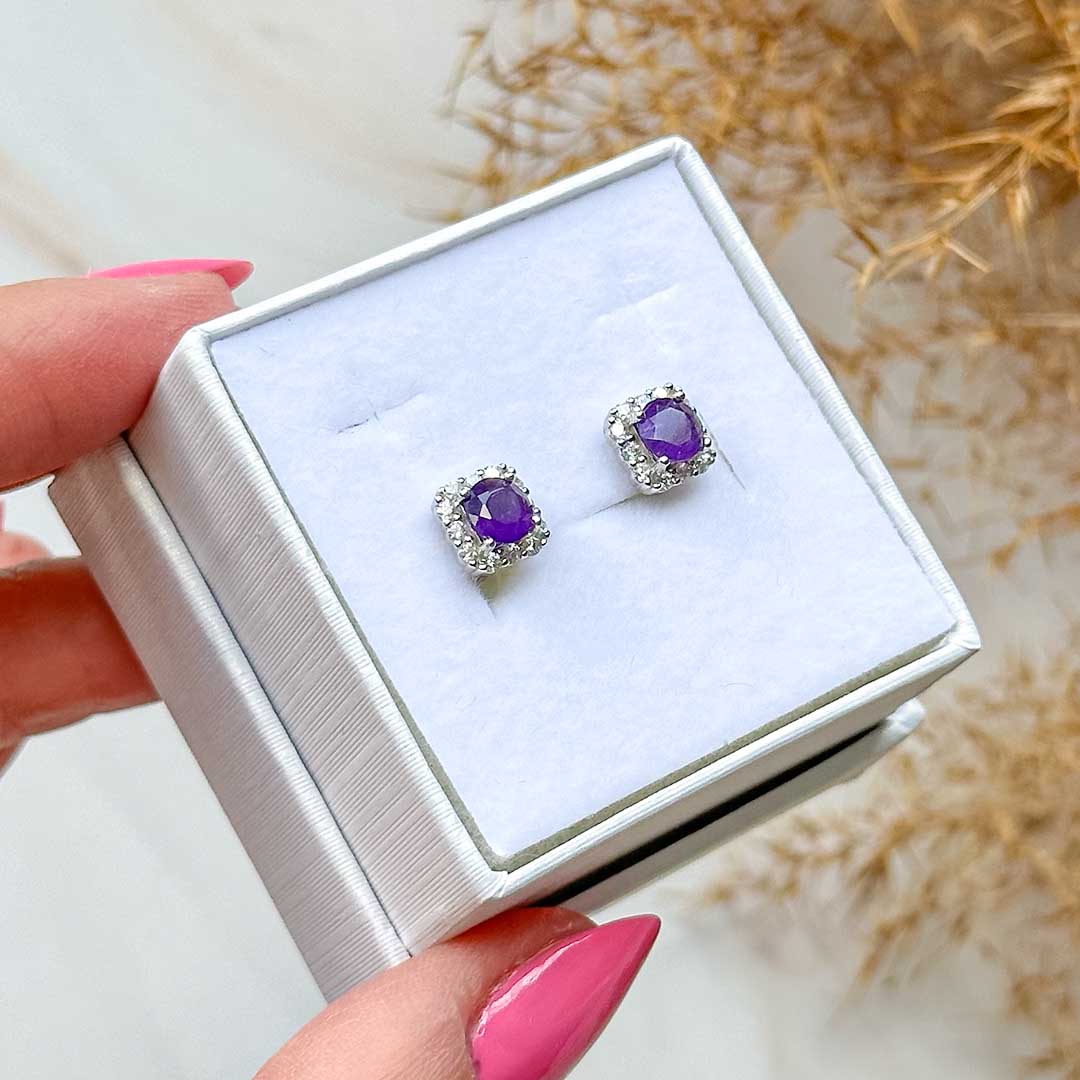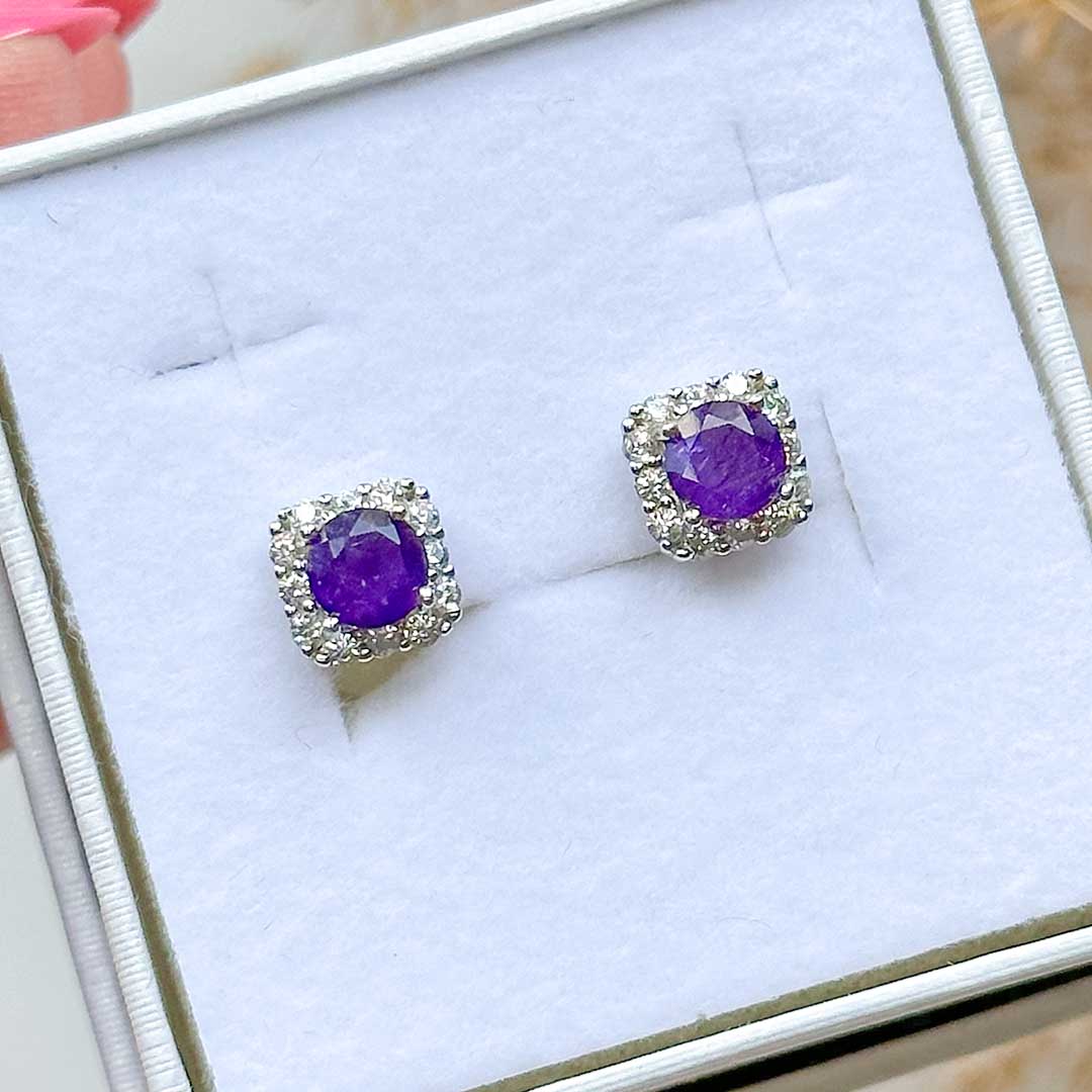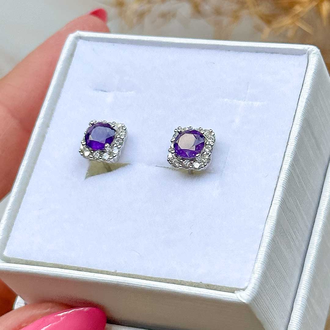 Gyönyörű ezüst fülbevaló drágakő minőségű és csiszolású ametiszttel! Az ezüst nyomat a szárban olvasható.
