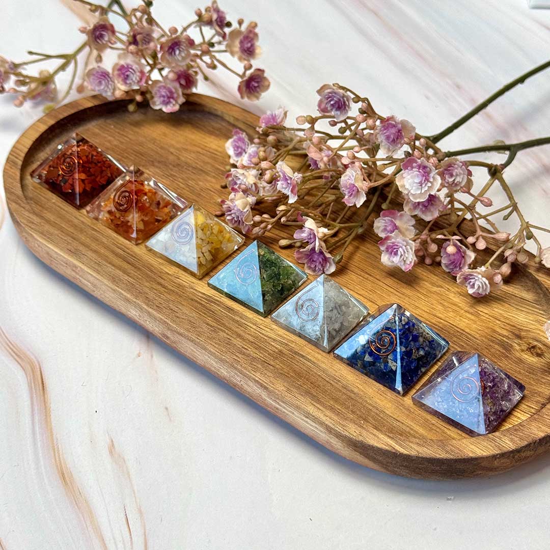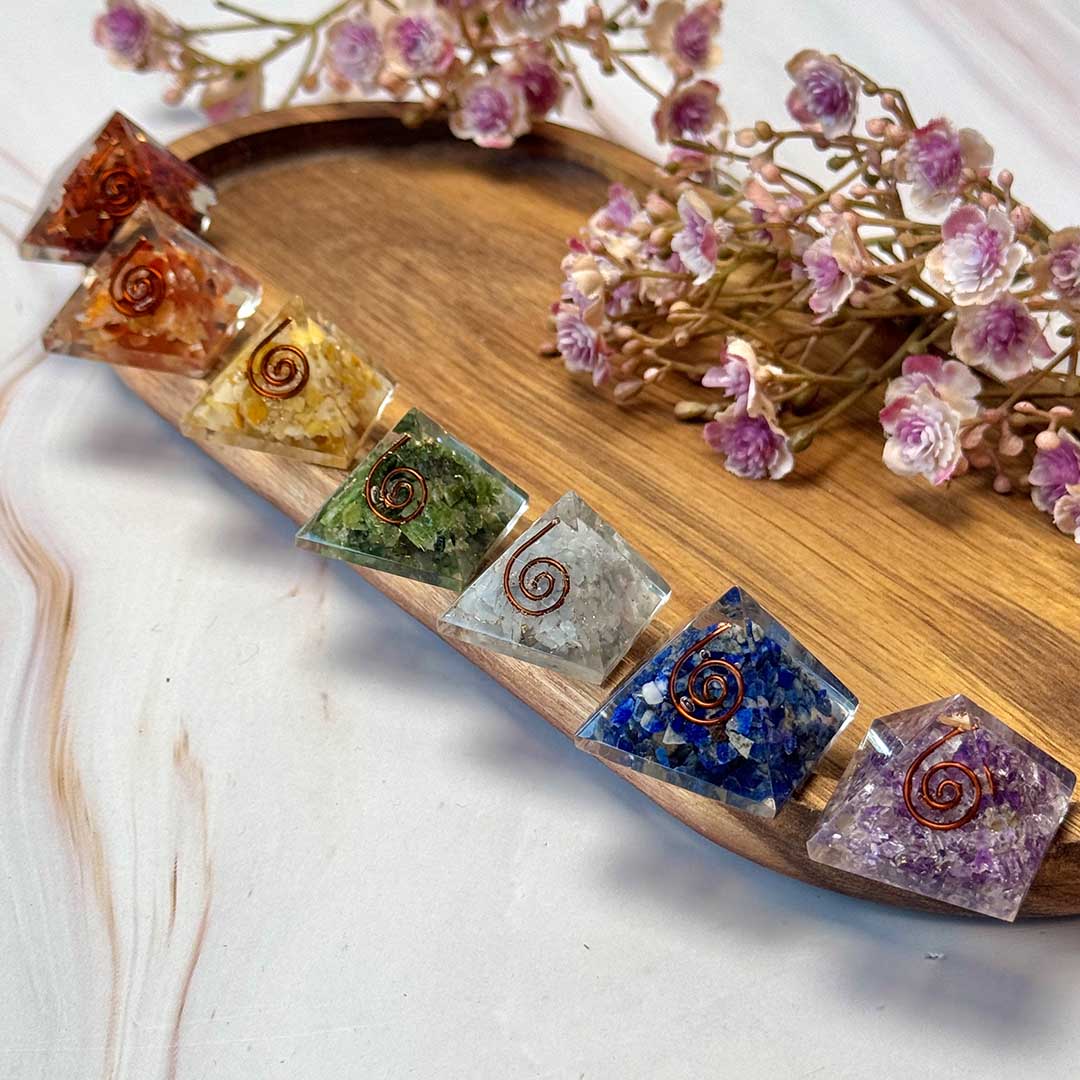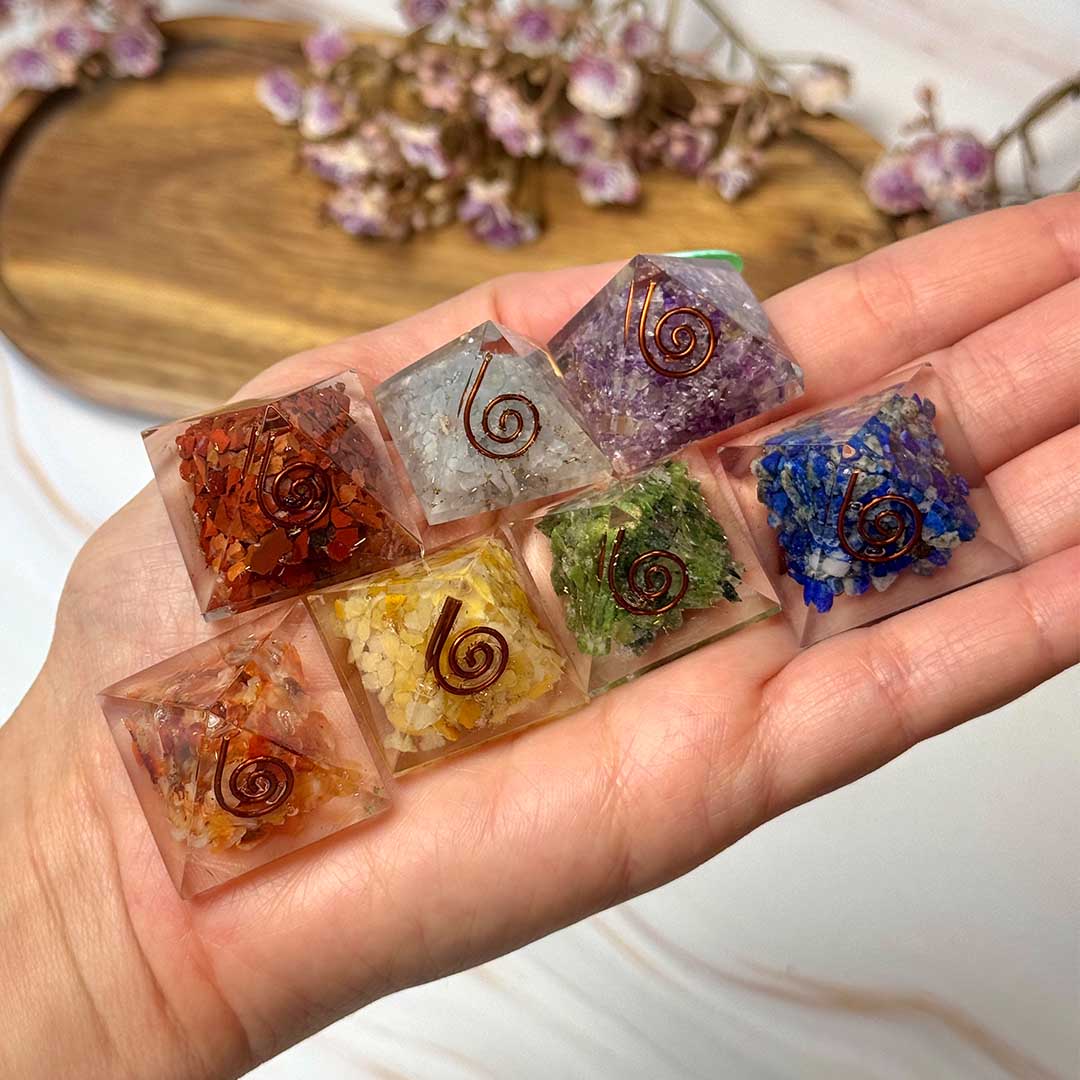 Ez a hét csakrás orgonit piramis kifejezetten a csakrák egyensúlyba hozására készült. Az egyes piramisokban válogatott ásványok találhatók, amelyek mindegyike egy-egy csakrához kapcsolódik: