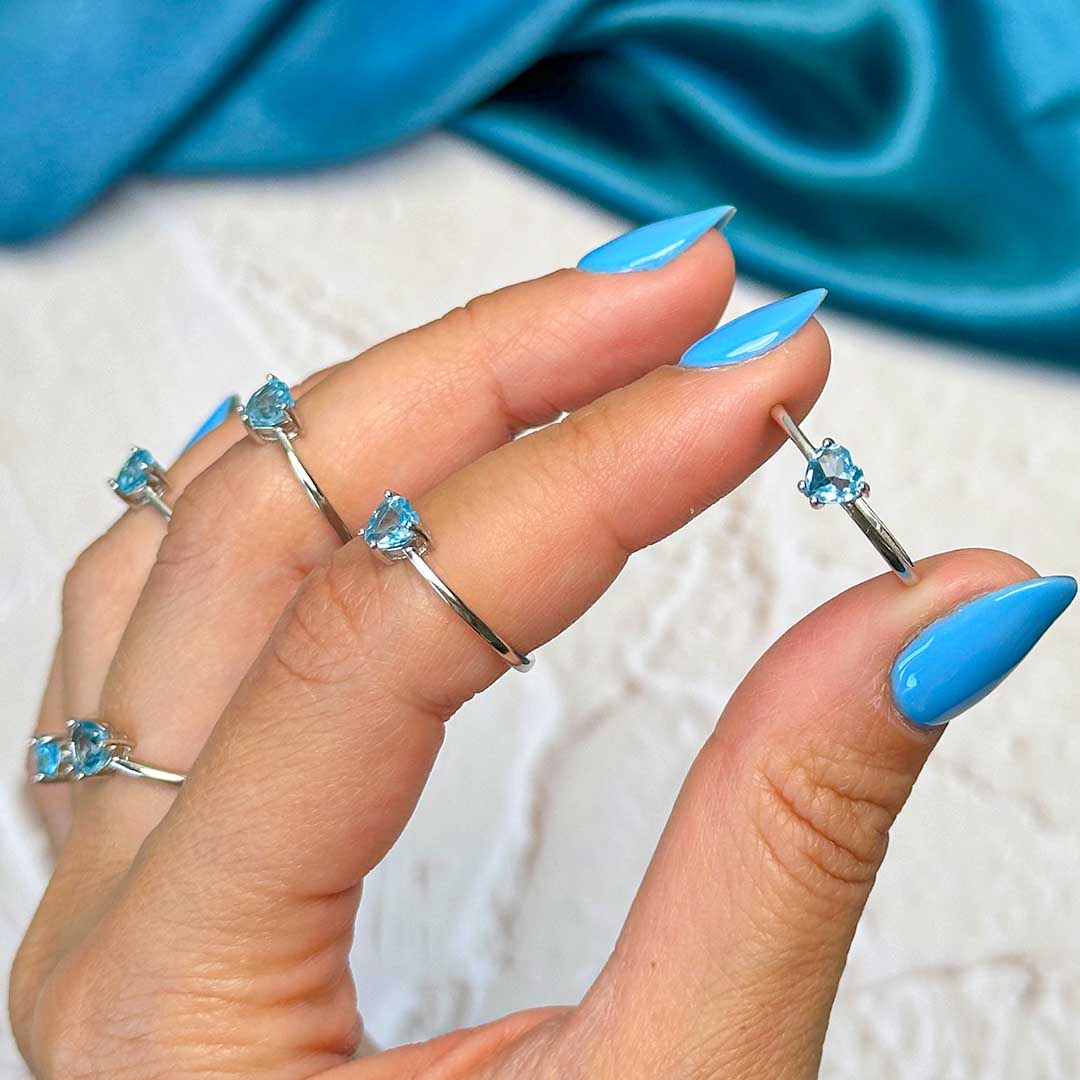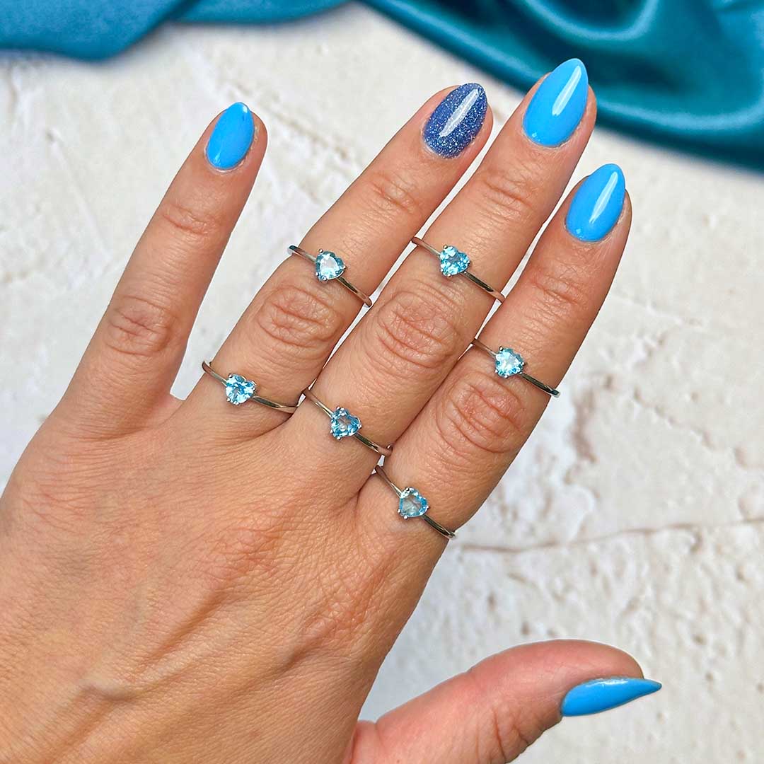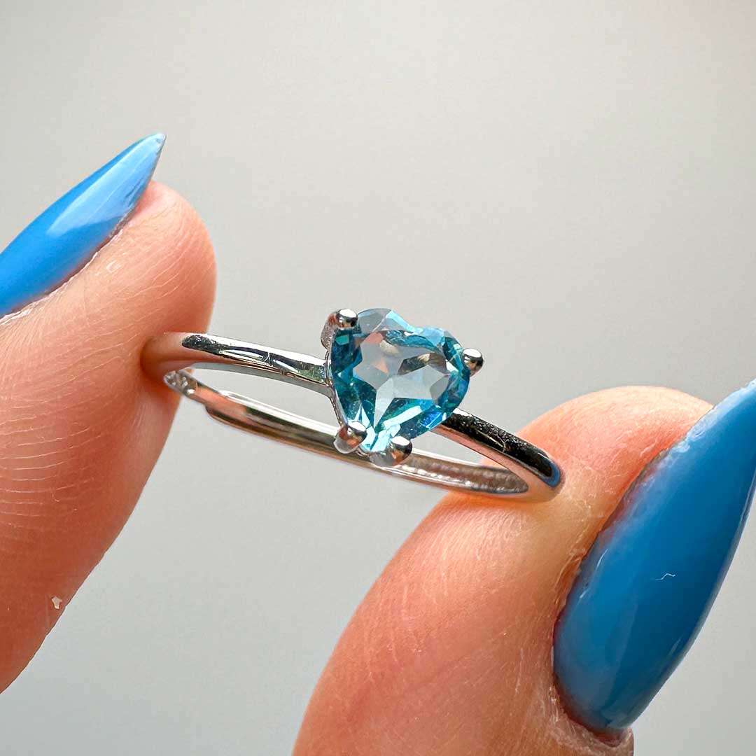 Elképesztő minőségű Topáz köves gyűrű, szív alakú fazettált kék topázzal! A topázok átlátszók, csillogók, tiszták és vízkékek - gyönyörű minőség, ezüst, állítható méretű gyűrűben!