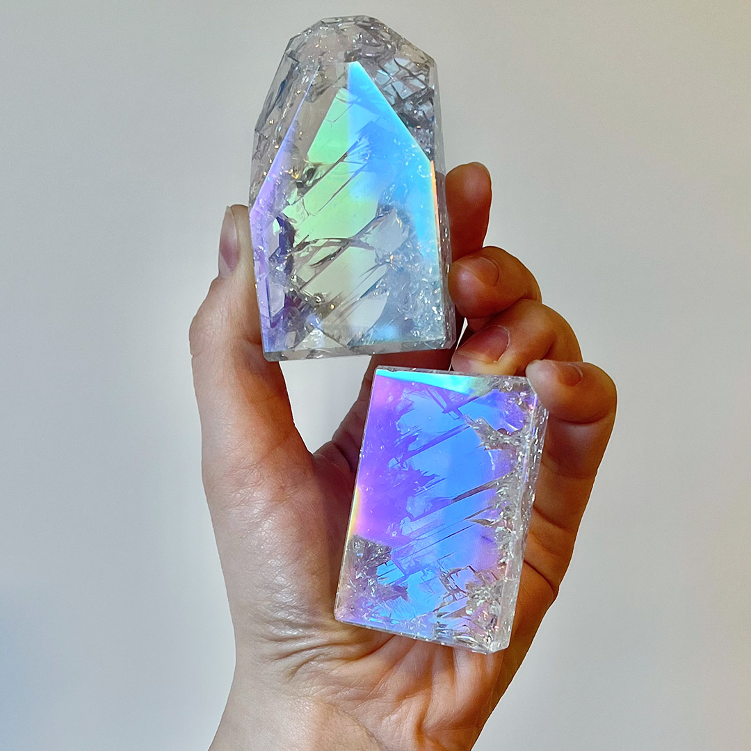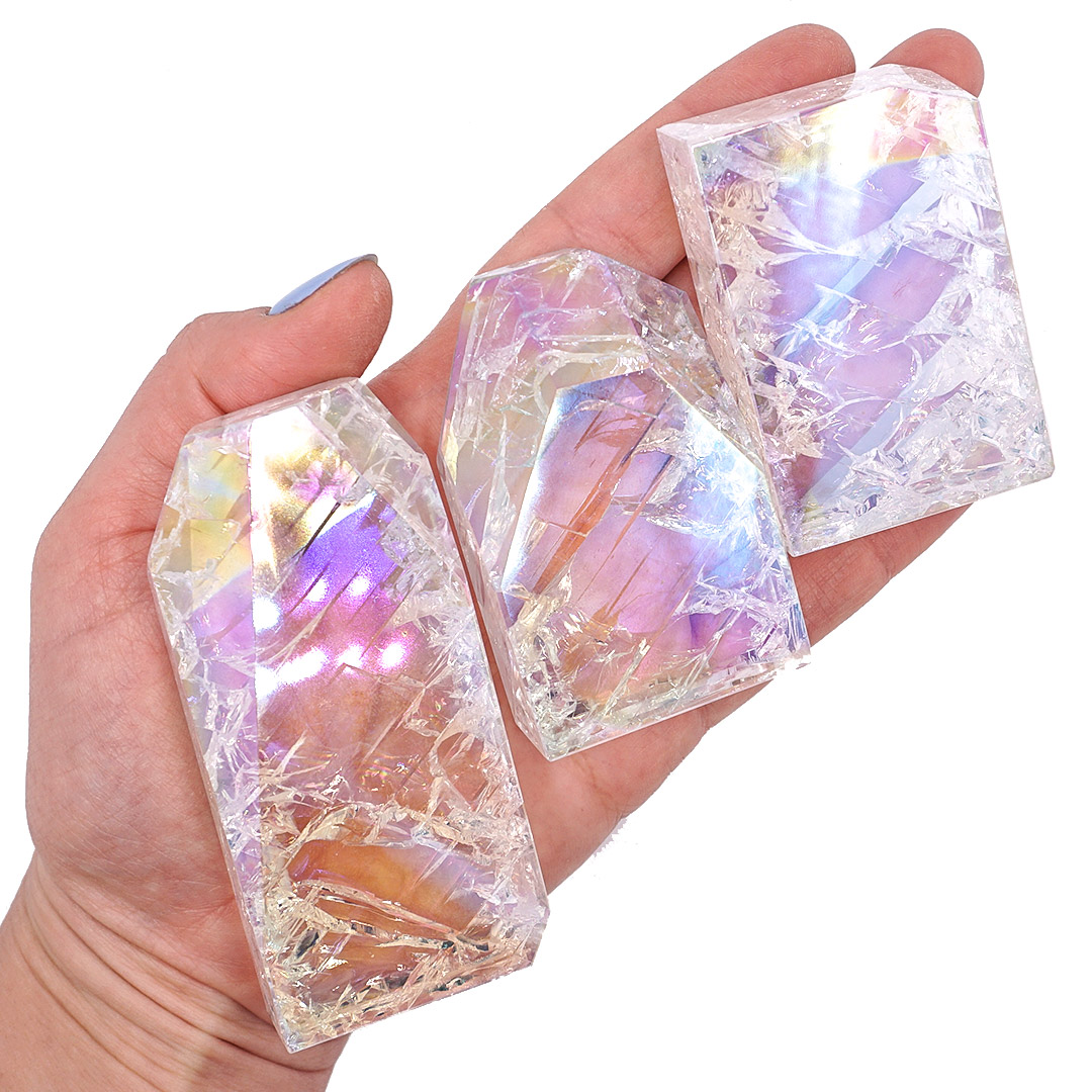 Roppantott, aurázott kvarc formák két méretben. Közepesek mérete kb. 5,8 cm - 6,5 cm. Nagy kvarcok mérete kb. 7,7 cm - 8,5 cm.