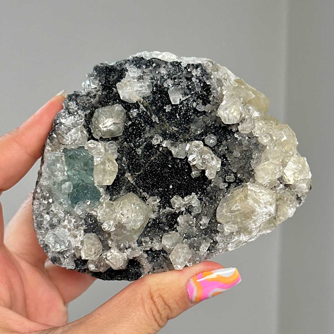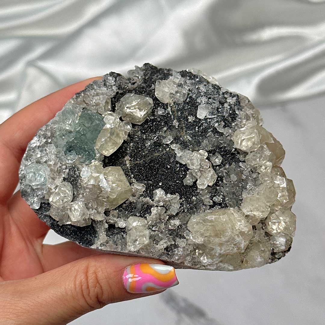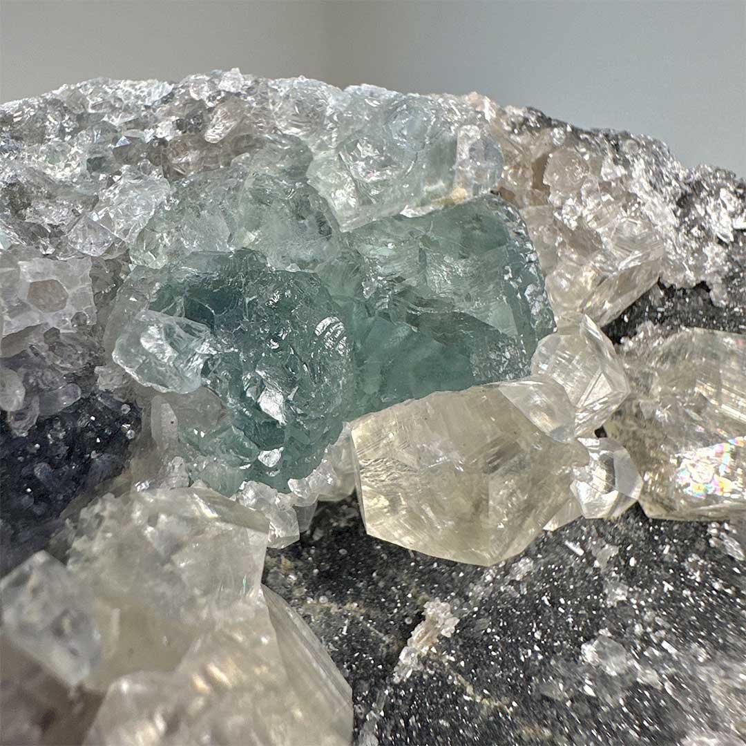Szuper extra kombináció! Ritkán látható Fekete kvarckristályos felületre különböző ásványok telepedtek: szivárványos kalcit, melyekben az üvegszerű, fehér kristályokban apró szivárványok csillannak meg, valamint látványos zöld fluorit! A telep UV reaktív, a fluorit kristályok kéken, a kalcitok pedig pirosan világítanak! Mérete: 10,5 cm x 8,5 cm