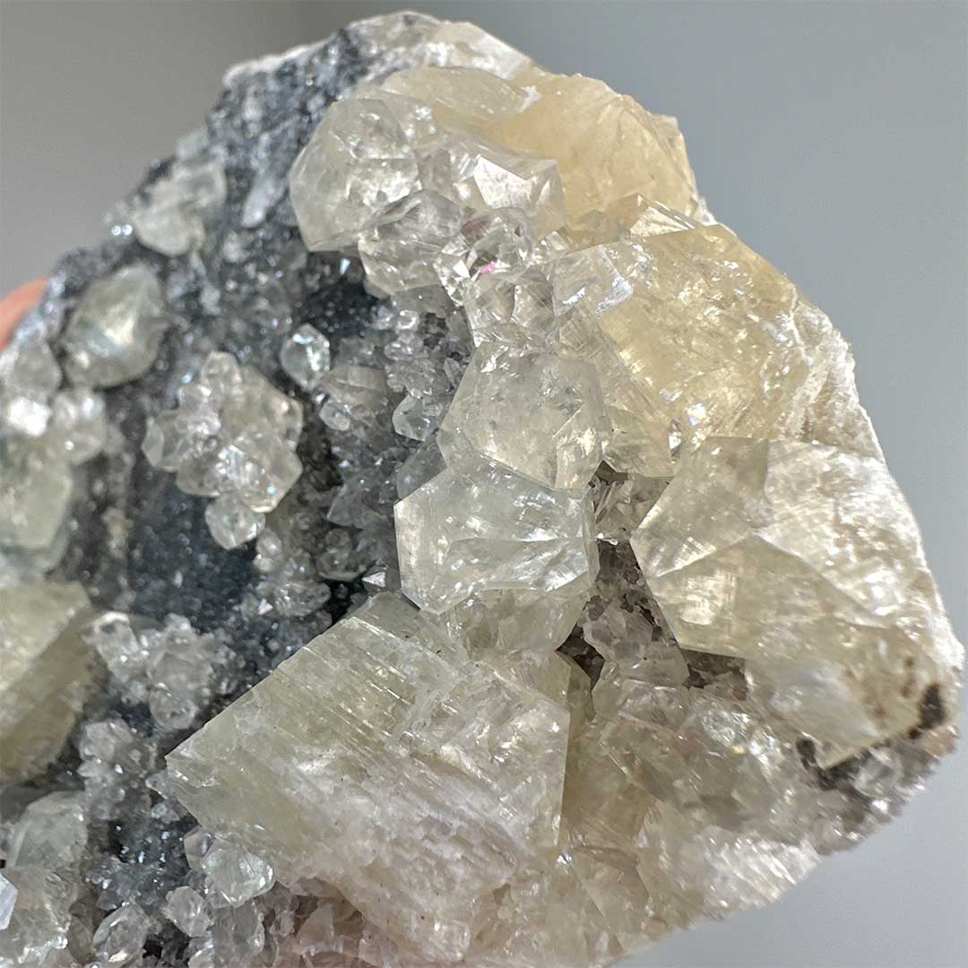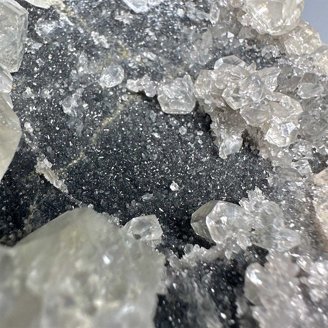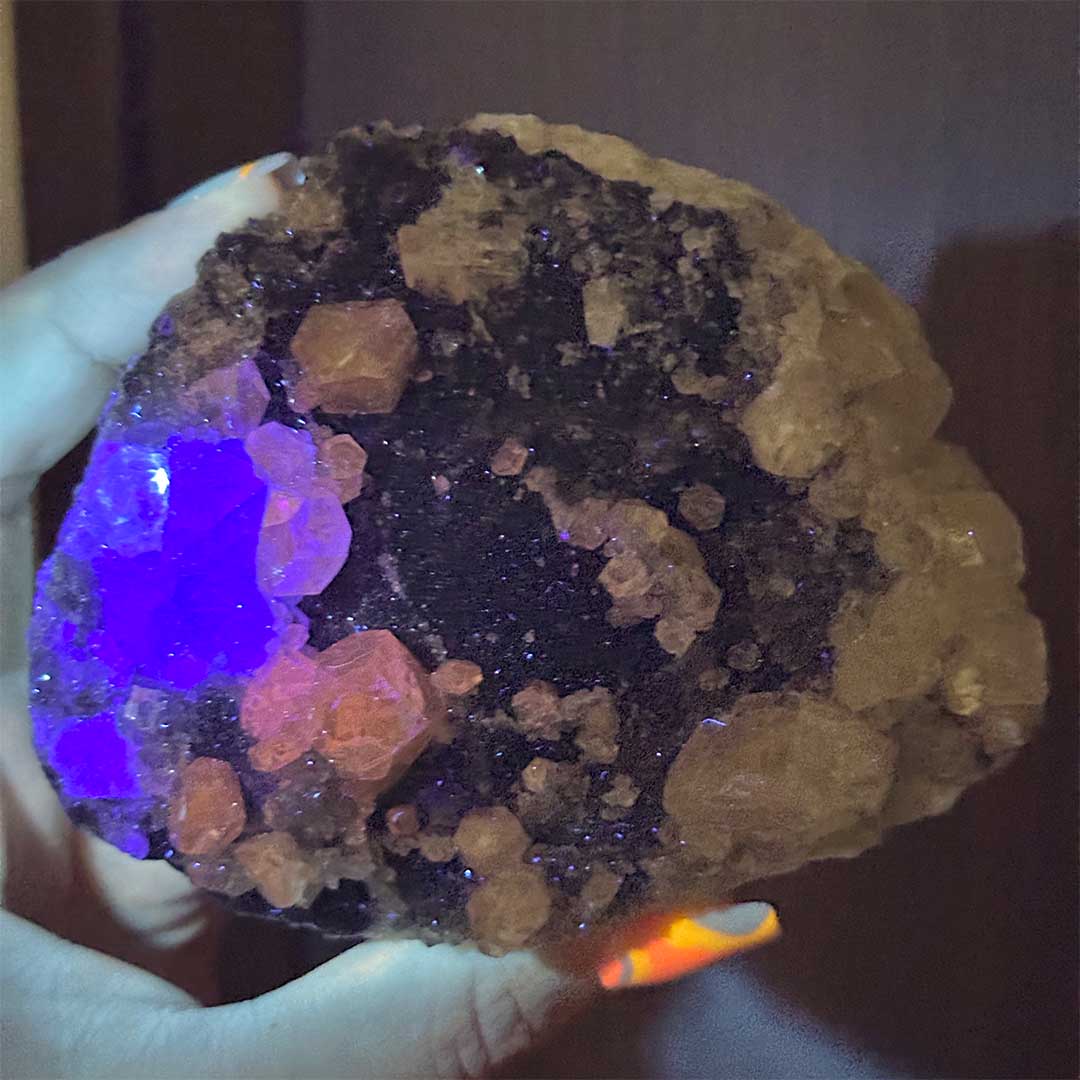 Szuper extra kombináció! Ritkán látható Fekete kvarckristályos felületre különböző ásványok telepedtek: szivárványos kalcit, melyekben az üvegszerű, fehér kristályokban apró szivárványok csillannak meg, valamint látványos zöld fluorit! A telep UV reaktív, a fluorit kristályok kéken, a kalcitok pedig pirosan világítanak! Mérete: 10,5 cm x 8,5 cm