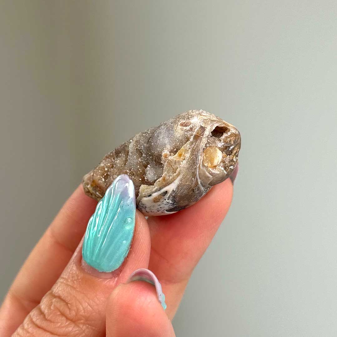 A megkövesedés során a fosszília kalcedon-kvarccá alakult, belsejében finom kvarckristályokkal – a csillogó, druzy-kvarc geódaszerű belső különlegesen látványossá teszi.