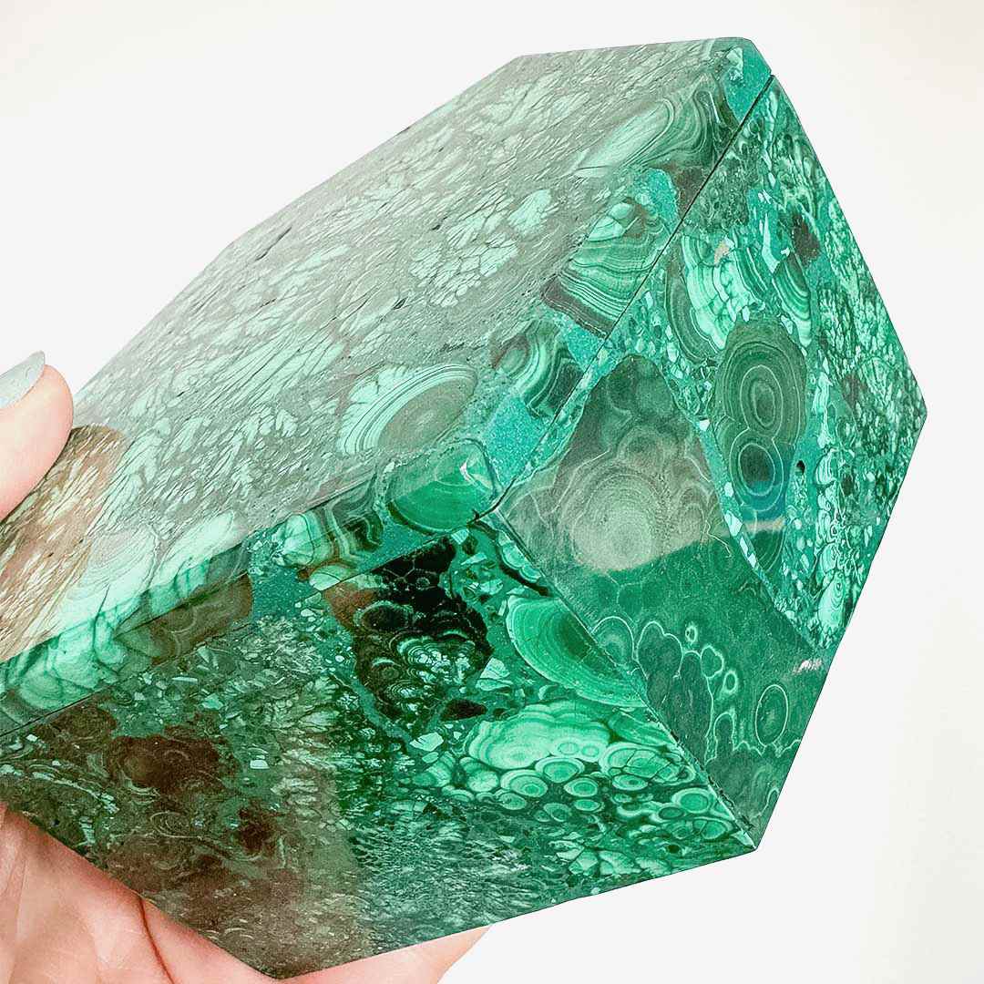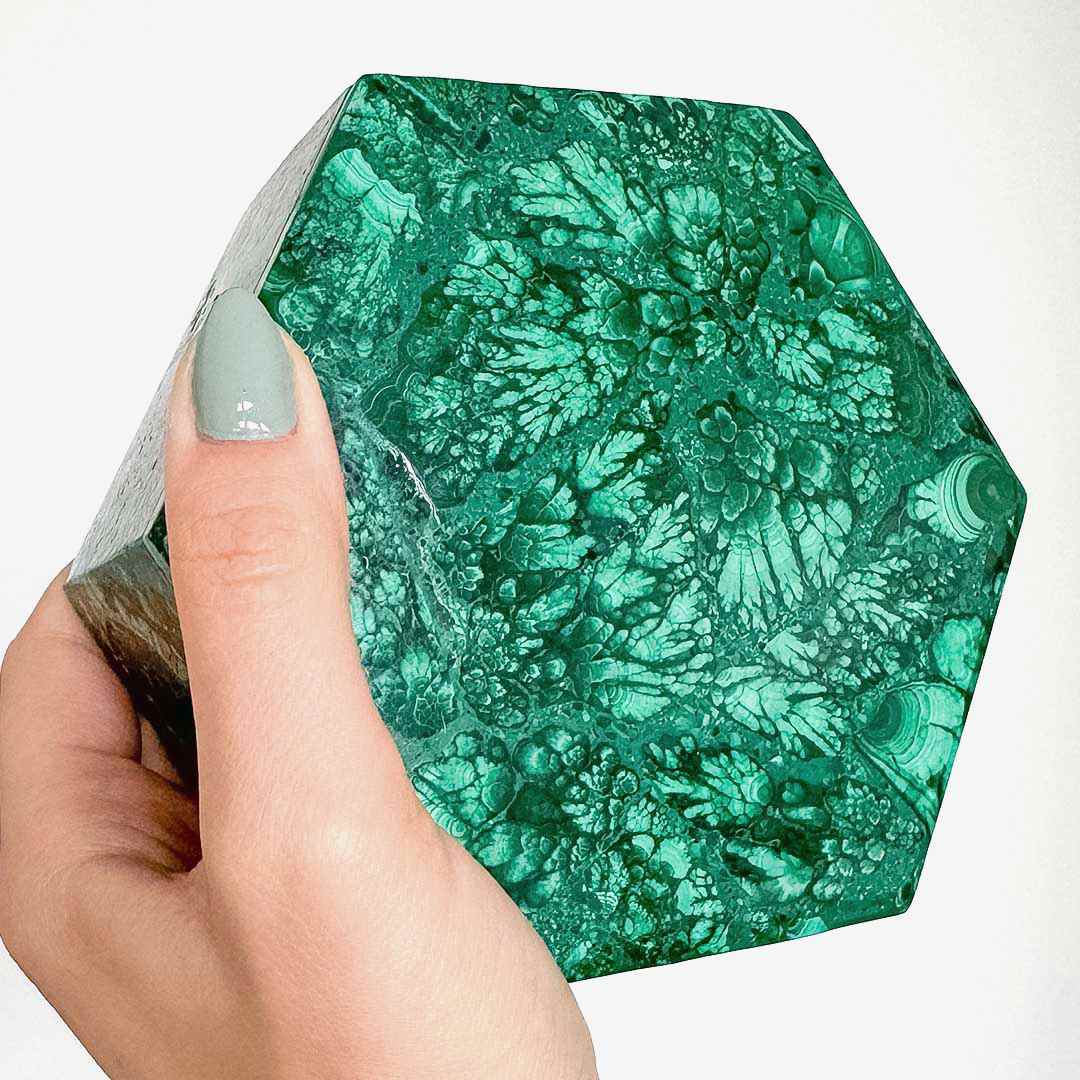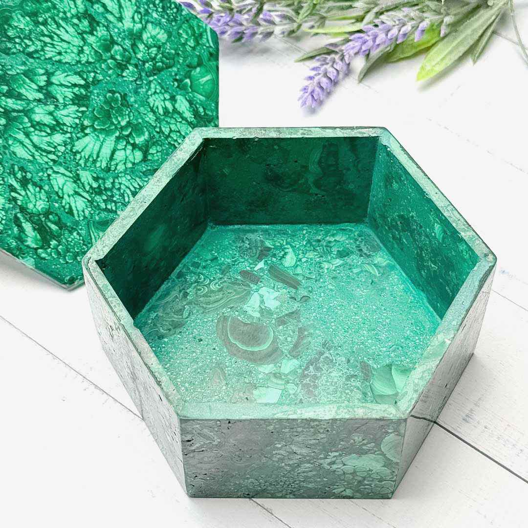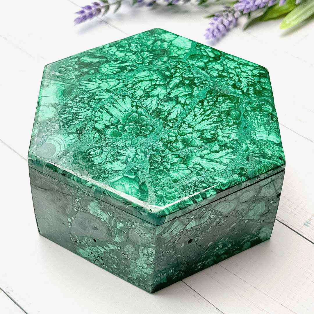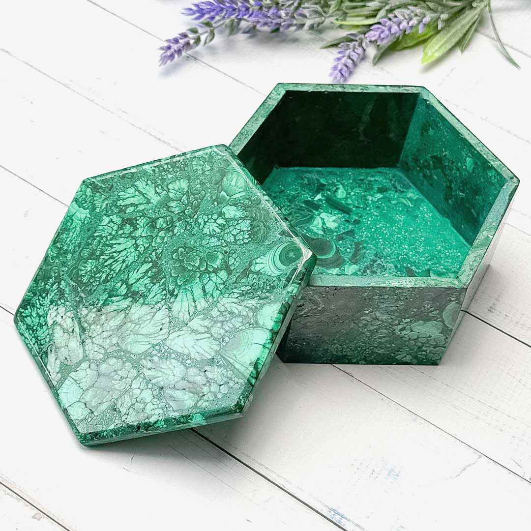 Elképesztő szépségű ládika teljes egészében Malachit ásványból, gyönyörű, levél lenyomatokra emlékeztető változatos mintázatokkal.🍂 Hatszögletű szelence, mely értékálló kincs akár több életre.. Ékszerek, kedves emlékek, féltett apróságok tárolására, vagy a lakás ékének is kiváló!🍀🙌🏻