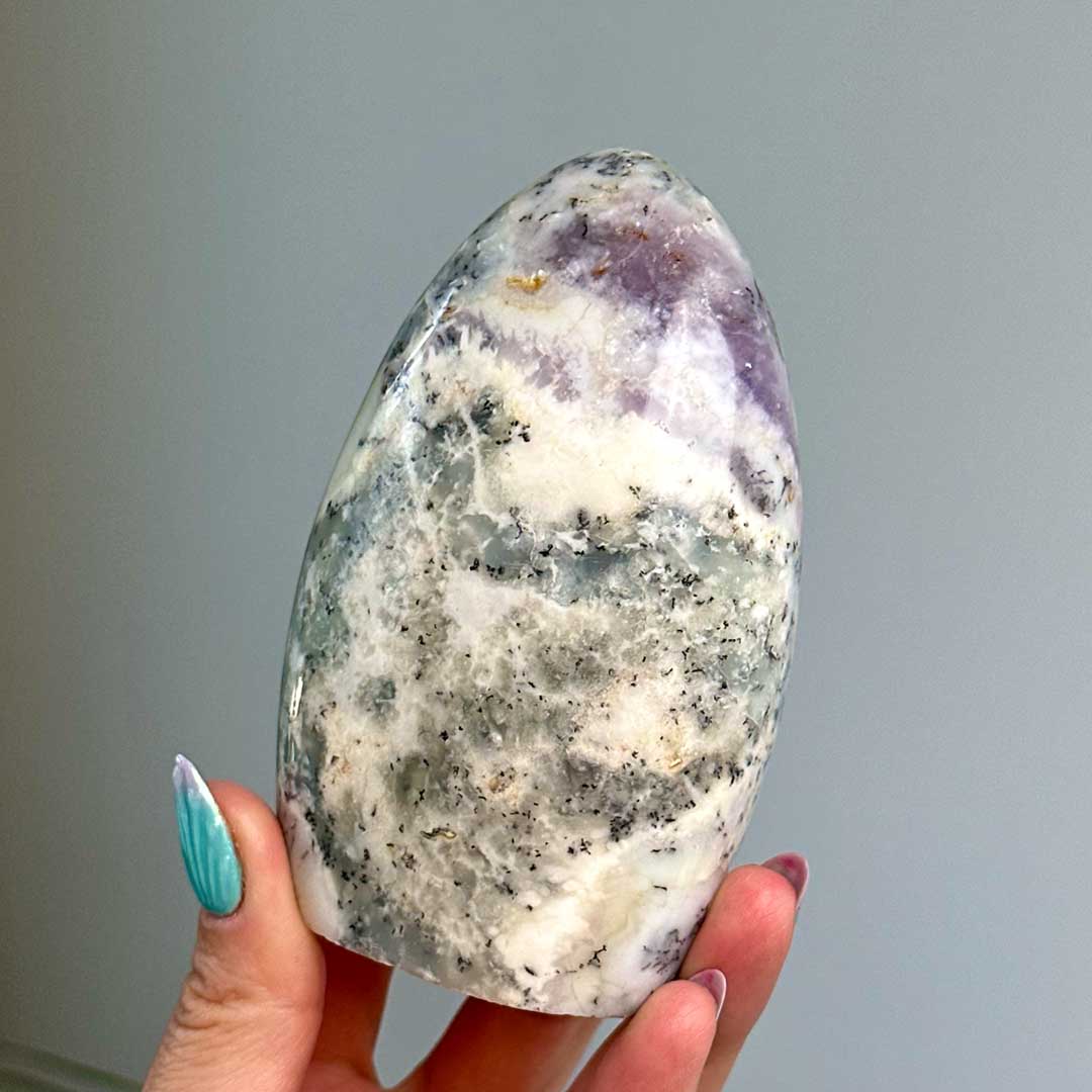 Csodaszép, válogatott legkülönlegesebb Merlinit állványok! Ezeket a Dendrites opálnak is nevezett állványokat a szuper mutatós mintázatai miatt imádjuk, tejfehér alapon fekete, lila, sárga mintázatokkal. Lenyűgöző dendrites mintázatok: kis ágacskák, párfány-növényke szerűen terülnek szét az ásványon, az opálos átlátszóbb részeken nyújtóznak befelé. Madagaszkáriak