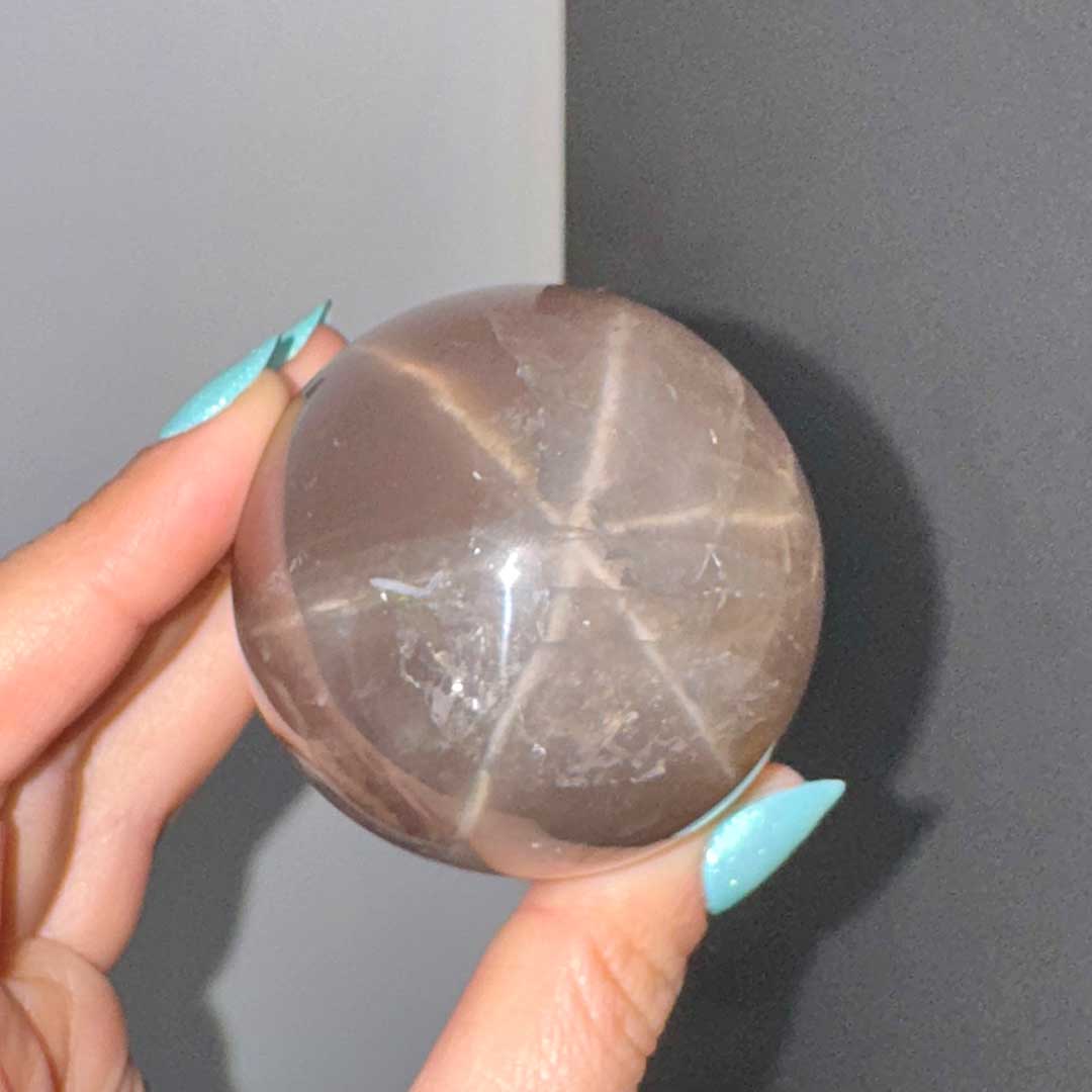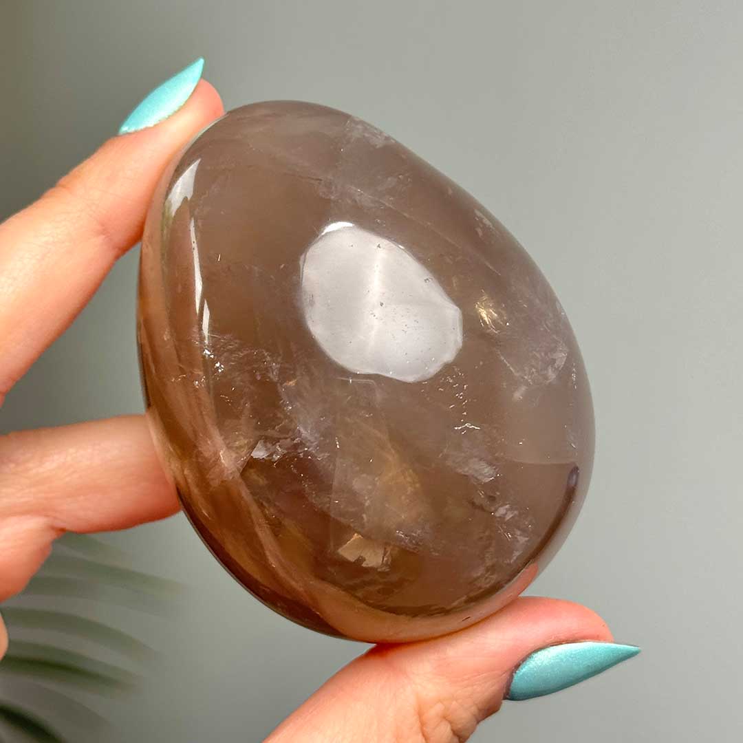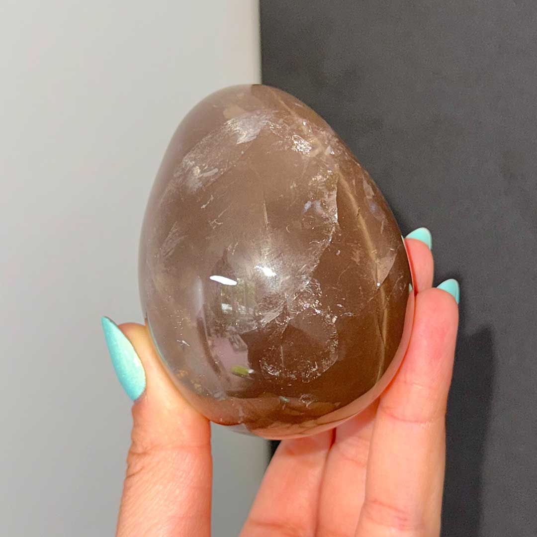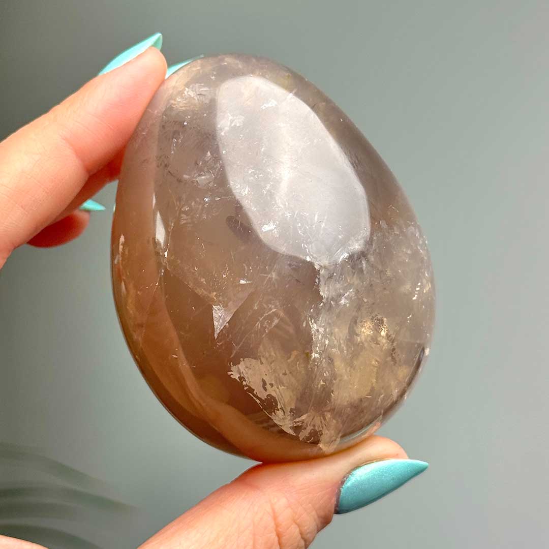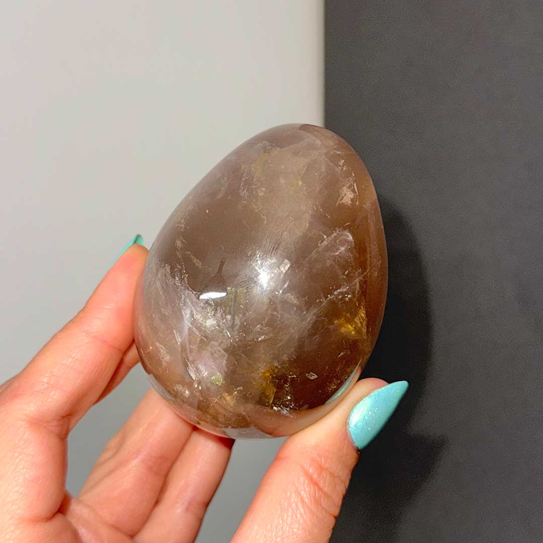 Lenyűgöző Starflash Füstkvarcunk érkezett! Ez a tojás formára csiszolt, pasztellesen áttetsző Füstkvarc megannyi csodát rejt: belső zárványaikban szivárványok csillannak meg, a tojás két pólusán pedig angyali jelenséget láthatunk: egymásba kapcsolódó csillag formázatot, ezt nevezzük starflashnek (csak a legmagasabb minőségű ásvány megfelelő csiszolásánál fordul elő) a fénnyalábok pedig a két csillagot az egész tojás felületén összekötik. A füstkvarc földel és segít elengedni a hiánytudatot, így helyet teremt az anyagi és lelki bőségnek.