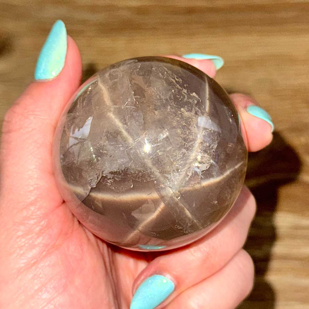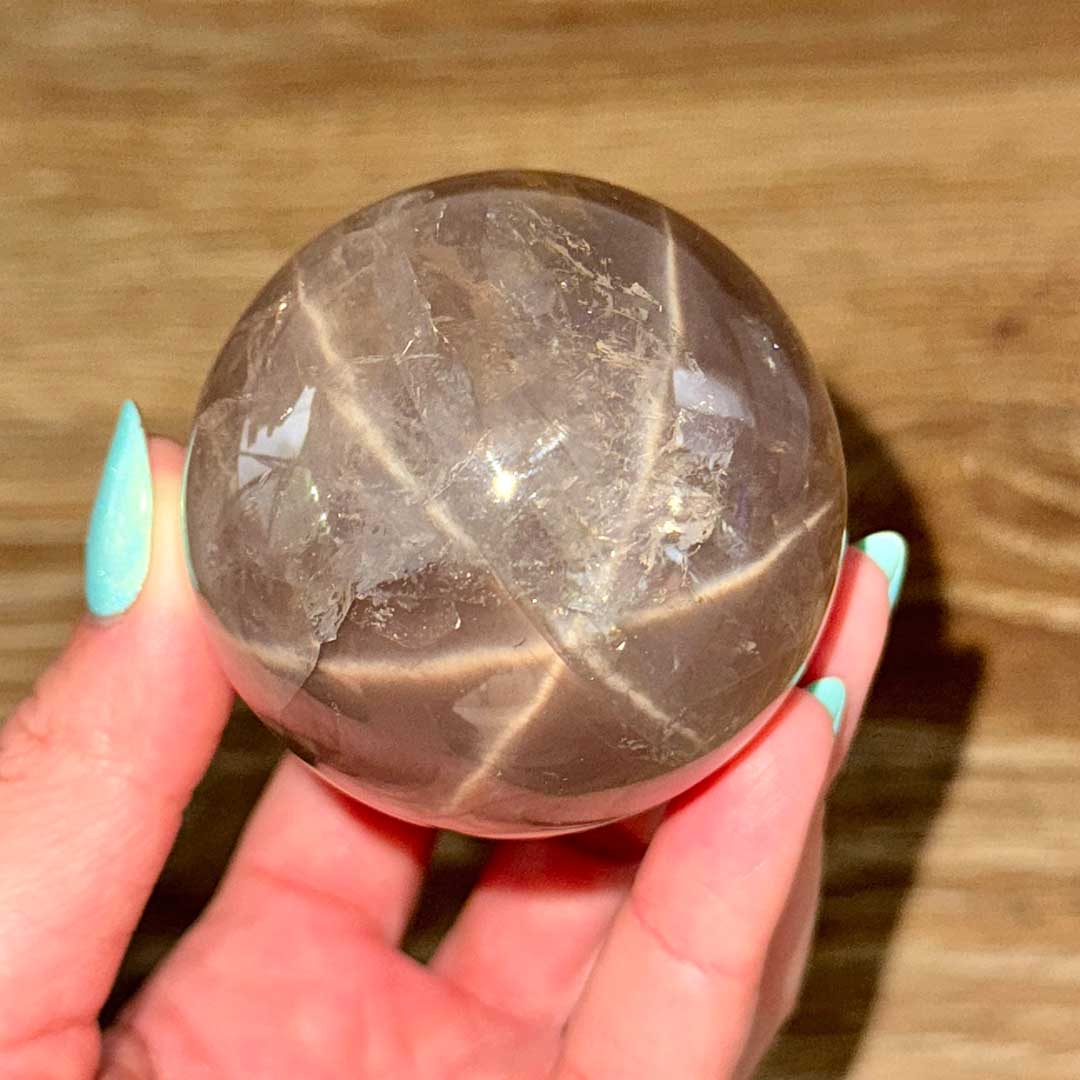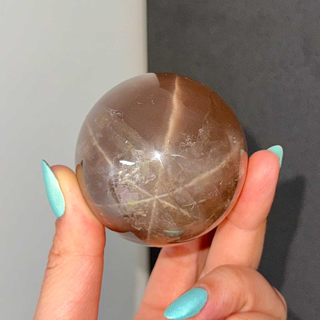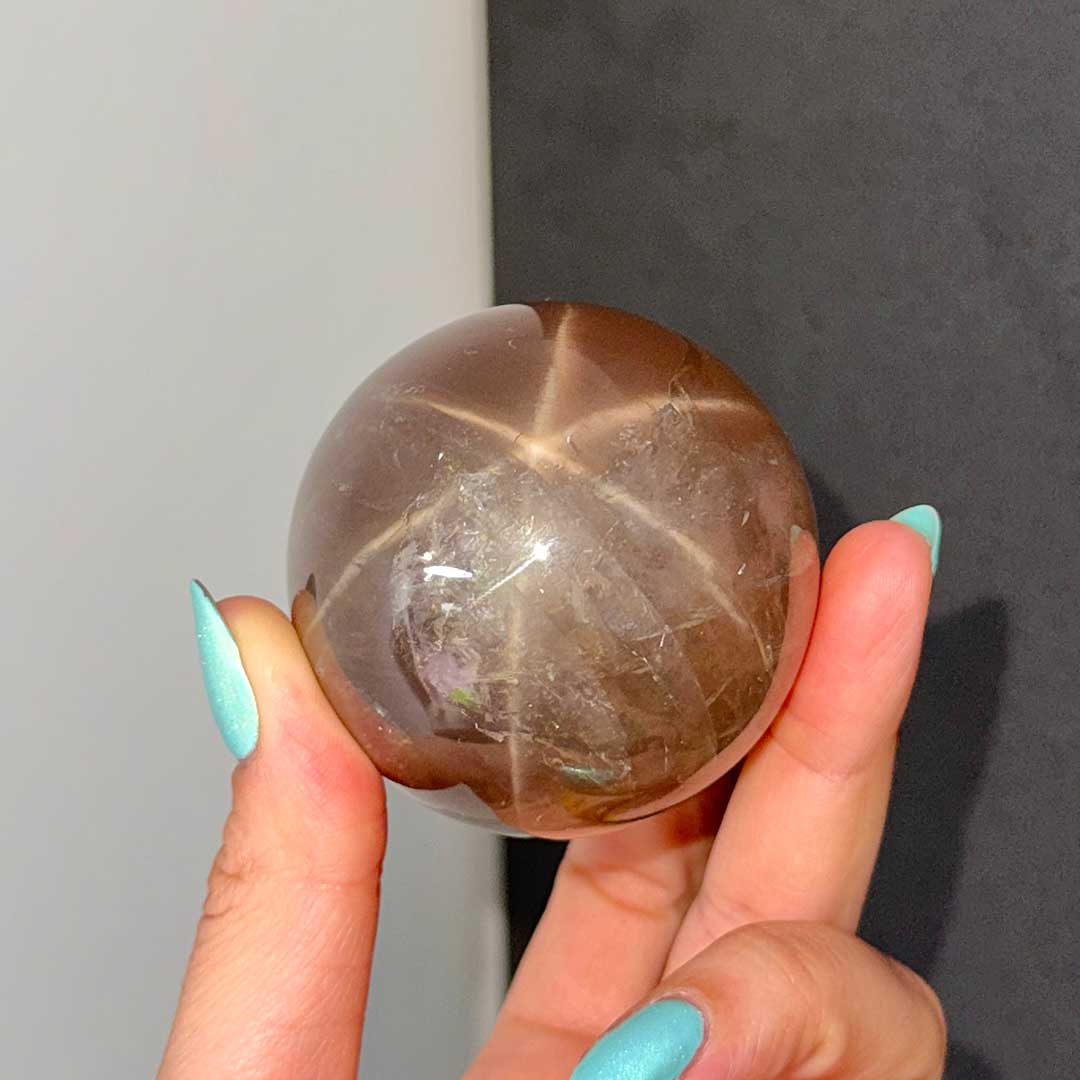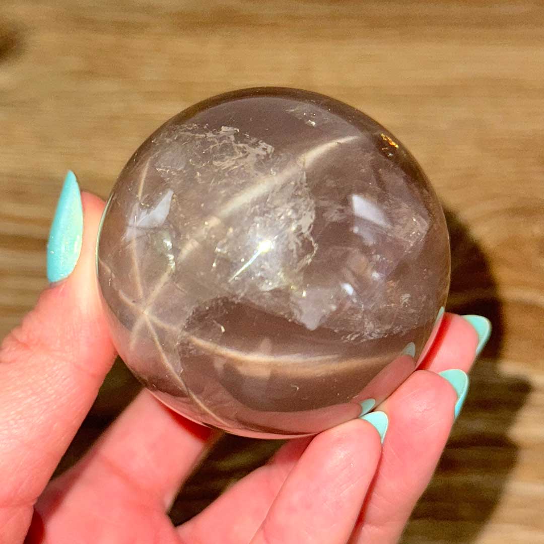 Lenyűgöző Starflash Füstkvarcunk érkezett! Ez a tojás formára csiszolt, pasztellesen áttetsző Füstkvarc megannyi csodát rejt: belső zárványaikban szivárványok csillannak meg, a tojás két pólusán pedig angyali jelenséget láthatunk: egymásba kapcsolódó csillag formázatot, ezt nevezzük starflashnek (csak a legmagasabb minőségű ásvány megfelelő csiszolásánál fordul elő) a fénnyalábok pedig a két csillagot az egész tojás felületén összekötik. A füstkvarc földel és segít elengedni a hiánytudatot, így helyet teremt az anyagi és lelki bőségnek.