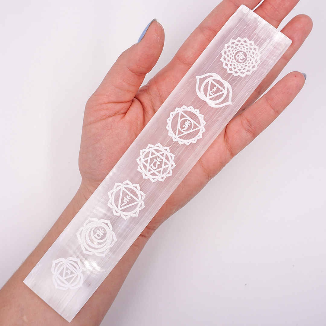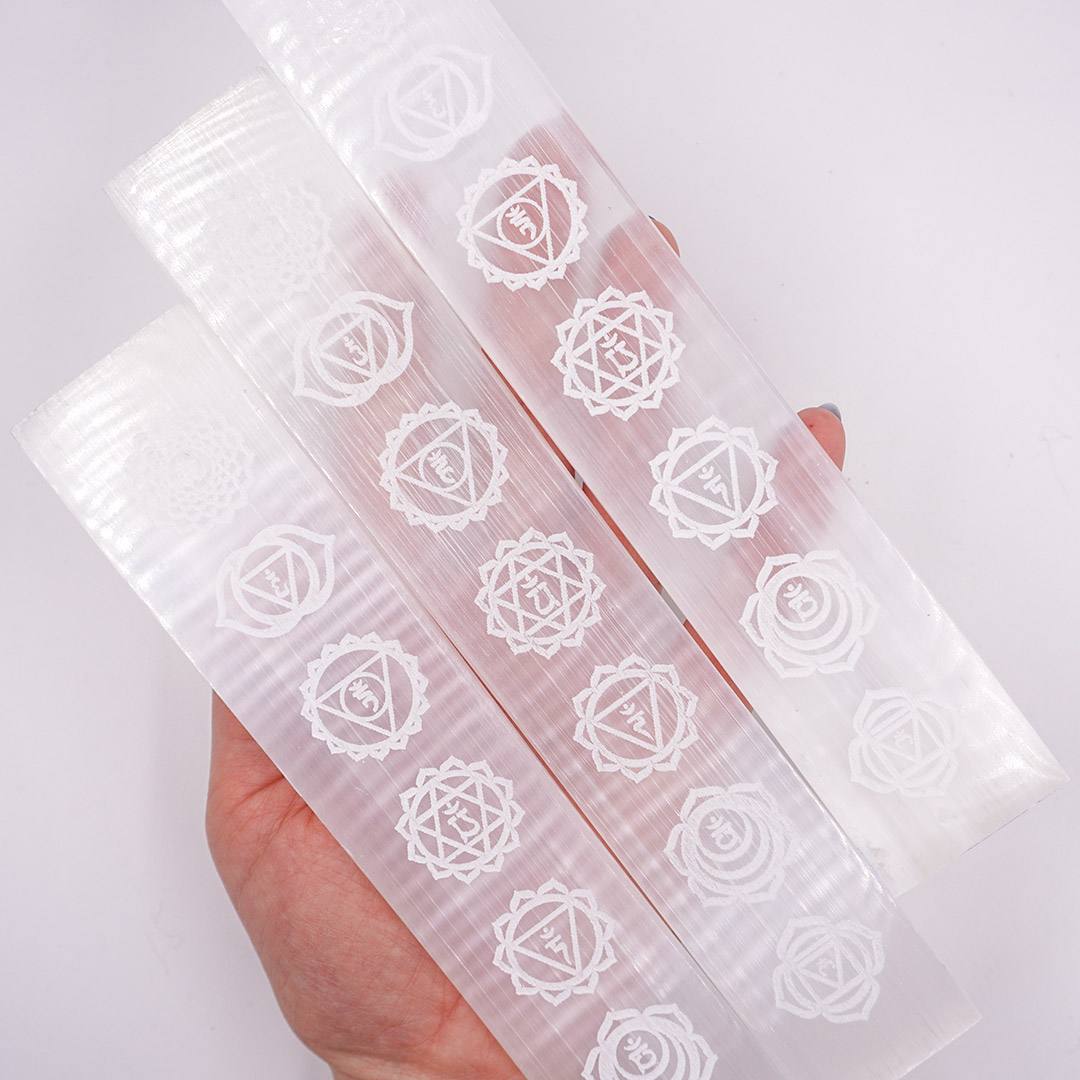 Gyönyörűen kidolgozott csakrás karcolatokkal ellátott fényes szelenit lapok, melyek tökéletesek tisztításhoz és ásványtöltéshez.