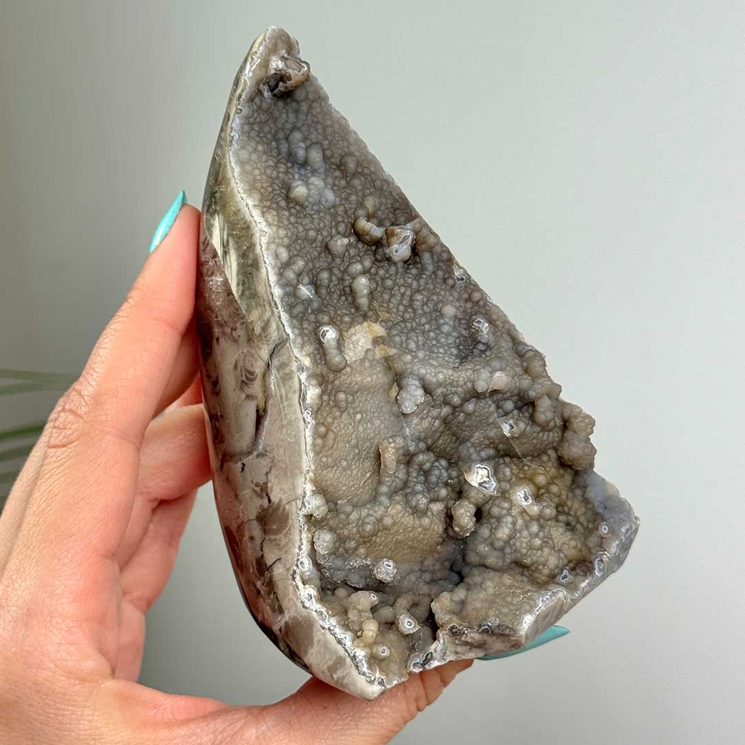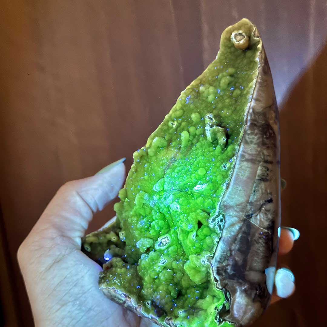 Kalcedonos rétegű felső oldán kisebb mintákban figyelhető meg a buborékos jelleg, hátoldala csiszolt, különlegessége pedig, hogy UV fény alatt fluoreszkáló zöld mintákat fedezhetünk fel. Ez egy 100%-ban természetes jelenség, mely annak köszönhető, hogy az ásványkombinációban urán tartalmú kalcedon van jelen - több urán, erősebb zöld fény.