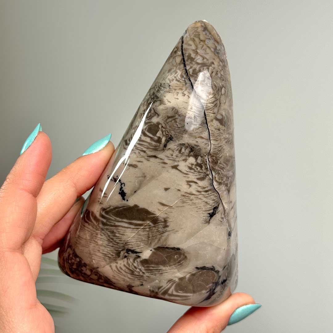 Lenyűgöző Vulkáni Achát nagy csiszolat! Igazi ritkaság, ezt az achát típust Vulkanikus achátnak is nevezik, mivel az achát vulkanikus kőzetekben előforduló erek és hasadékok kitöltésével keletkezett.