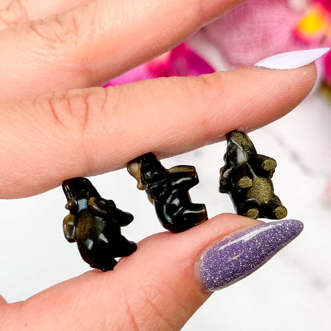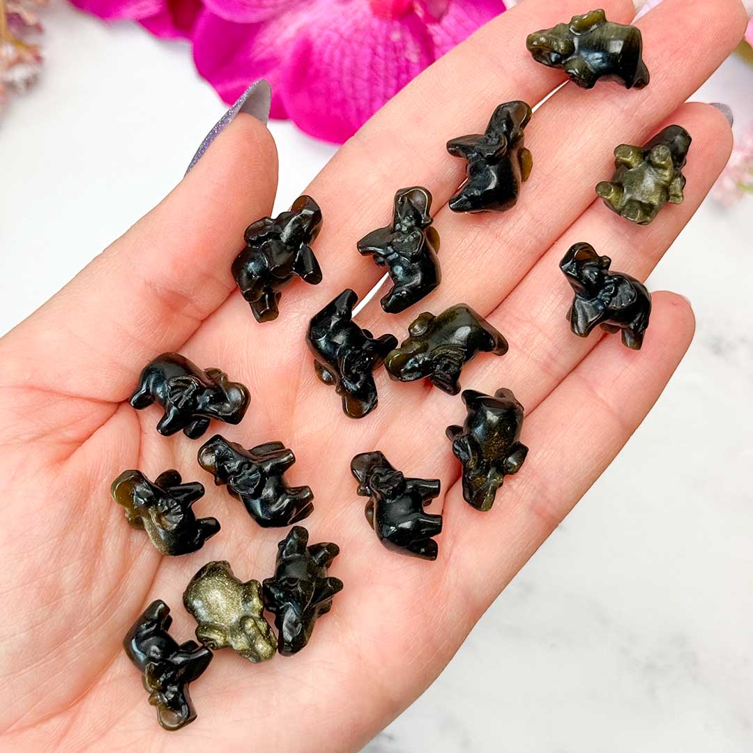 Tündéri arany fényű obszidián elefántok, melyeknek oldala fekete színű, hasa és háta pedig arany színben irizál!