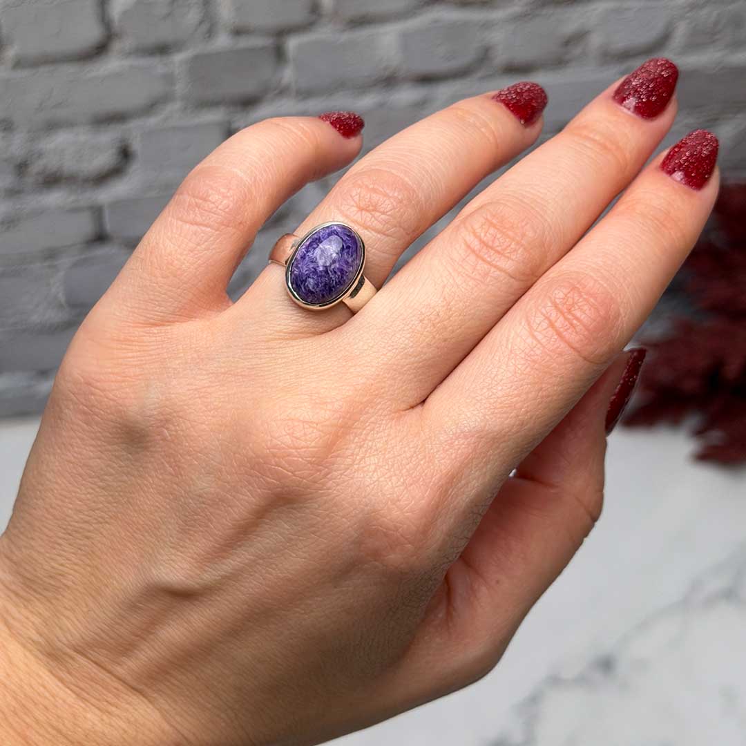Ez a Csaroit állítható ezüst gyűrű különleges, lila árnyalatú csaroit kővel készült, amely finoman csiszolt felülete és jellegzetes mintázata miatt igazán egyedi. A csaroit egy ritka szilikát ásvány, amely Oroszországból származik, és mély, misztikus lila színéről ismert. Ez az S925 ezüst foglalatú gyűrű elegáns, karakteres ékszer, amely egyediséget és stílust kölcsönöz viselőjének, állítható méreténél fogva pedig könnyedén személyre is szabható.
