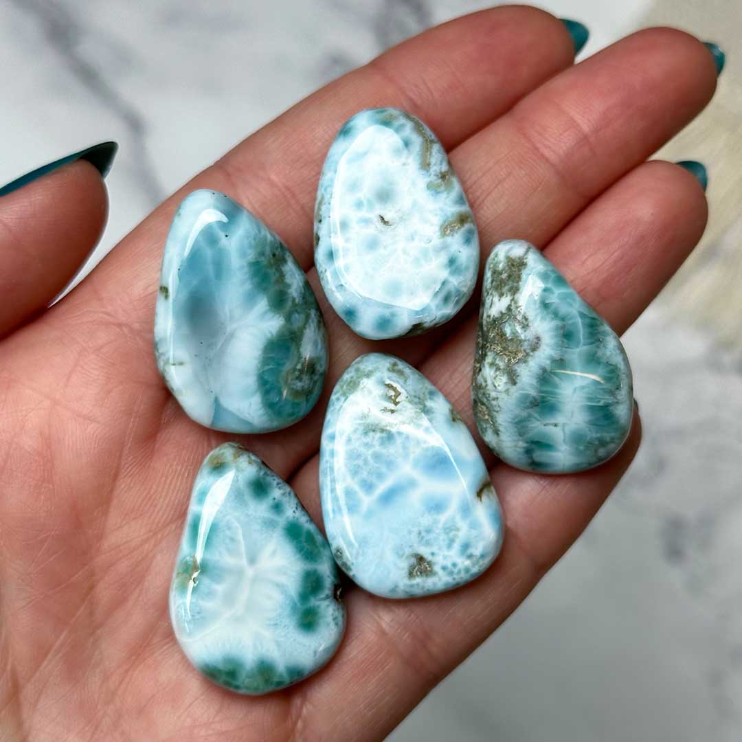 Gyönyörű Larimár csepp marokkövek, szabadformára csiszolva! A Dominikai Köztársaság ritka drágaköve a larimár, amelyet a tenger hullámzó kékje és a fehér fodrozódásai tesznek igazán különlegessé. Ezek a minőségi darabok egyedülálló mintázatukkal és árnyalataikkal minden kőben más és más szépséget rejtenek.