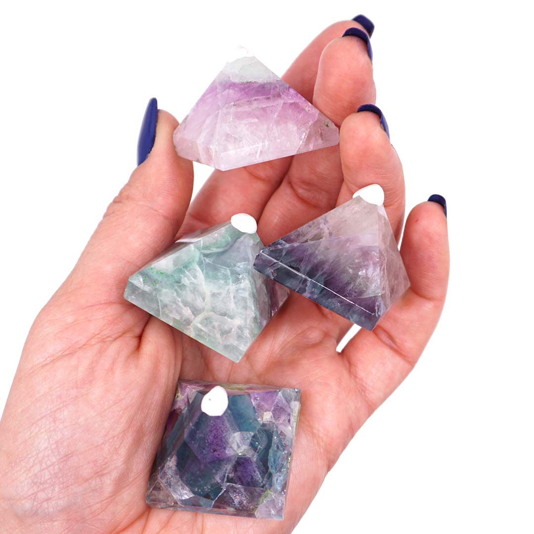 Tündéri szivárvány fluorit piramisok, intenzív színekben: kék, zöld, lila színek kombinációja, sok darabban belső szivárványok, fényjátékok is megfigyelhetőek.