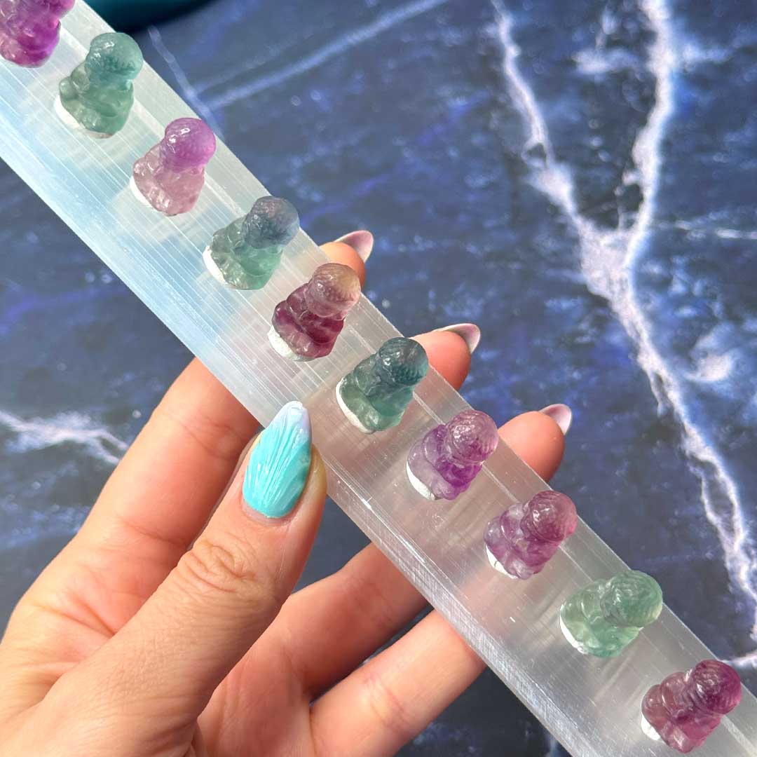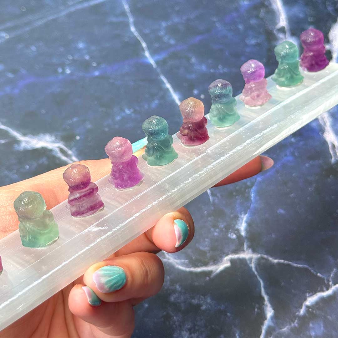 Az ülő Buddha a belső béke, bölcsesség és megvilágosodás jelképe. Fluoritból faragva különösen erőteljes hatású, hiszen az ásvány támogatja a tisztánlátást, koncentrációt és lelki egyensúlyt.