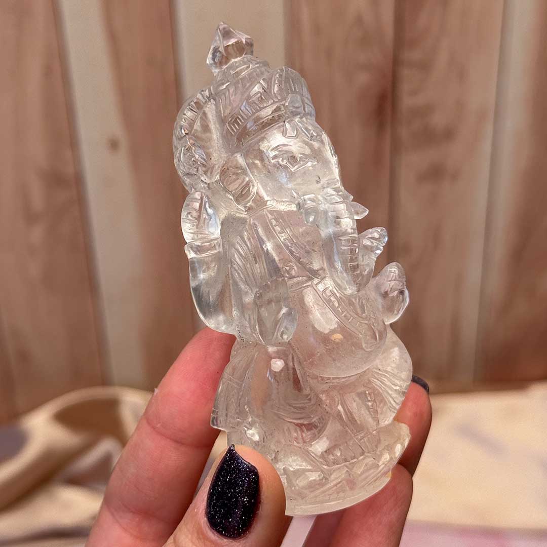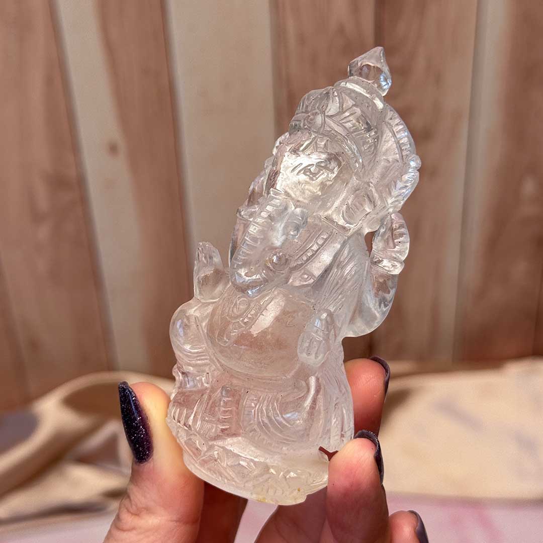 A Himalájai kvarcból faragott Ganesha a legmagasabb minőségű, víztiszta és derengőn áttetsző faragvány! A legprecízebb faragással, minden vonása átgondolt és rendkívül részletgazdag. A Himalája hegységről származó rendkívül tiszta kvarcot Indiában munkálták meg - a Ganesha az elefántfejű hindu isten a régióban tiszteletnek örvend, segítőként, jótevőként ismerik. Istenként tisztelik, otthonukban és munkahelyükön egyaránt elhelyezik szobrát. Csodaszép faragvány, és nagyon jó energiájú helyről hoztuk Őt!