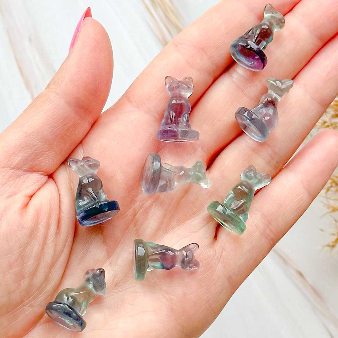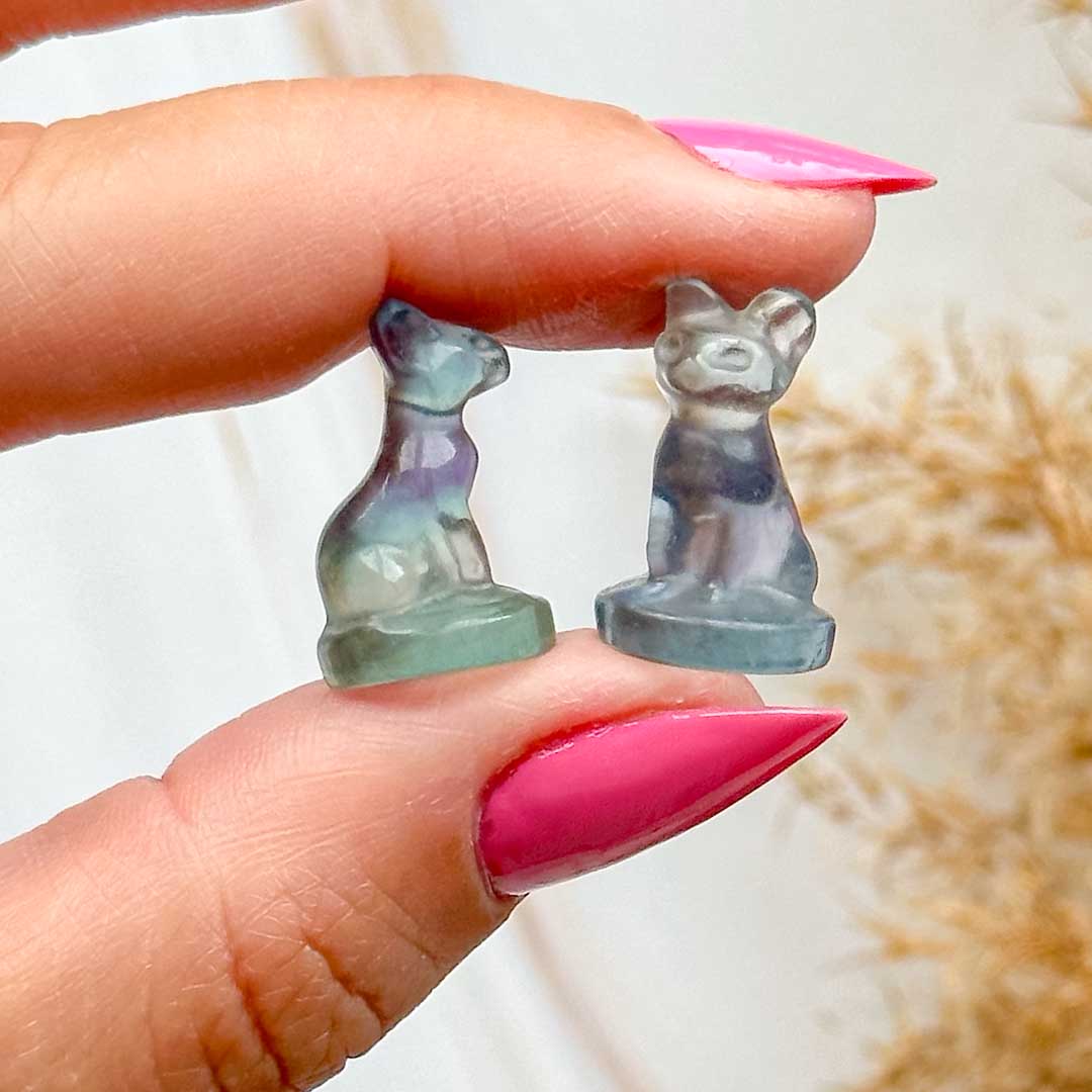 Tündéri fluorit mini csiszolataink érkeztek! Ezek az apró, de annál gondosabban kidolgozott faragványok különböző bájos alakzatokra kerültek alapos munkával csiszolásra. Zöld, lila és átmenetes fluorit anyagot használtak, így igazán színes és változatos, roppant mutatós kis kabalákat kaptunk! Válaszd ki a szívedhez leginkább közelebb állót, vagy állíts össze belőlük egy kis segítő csapatot!