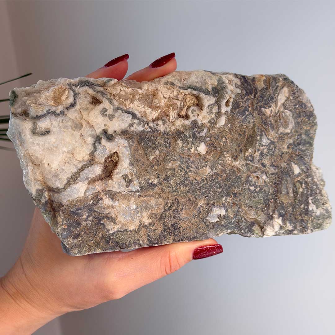 Megáll a talpán, felállítható! Ez a gyönyörű Moha Achát félig csiszolt, félig nyers formában készült, így egyszerre őrzi a természetes ásvány karakterét és mutatja meg a polírozott felület finom mintázatait. A kő jellegzetes, mohaszerű zöldes rajzolata különleges kontrasztot alkot a világosabb alapréteggel. A Moha Achát harmonikus színvilága és organikus formája elegáns, letisztult dekorációként, vagy akár gyűjteményi darabként is különleges megjelenést biztosít.