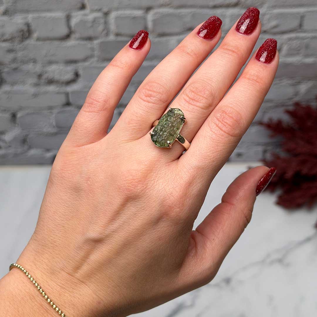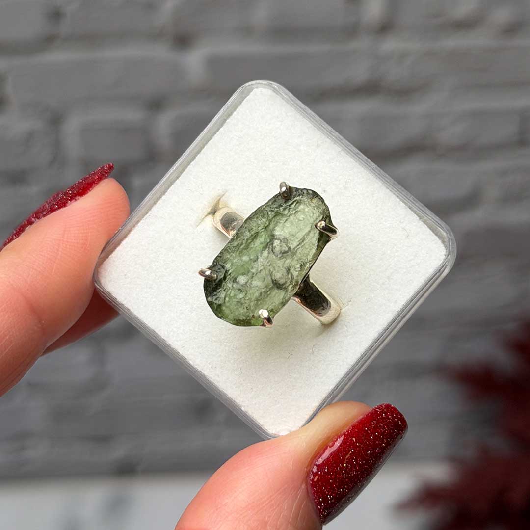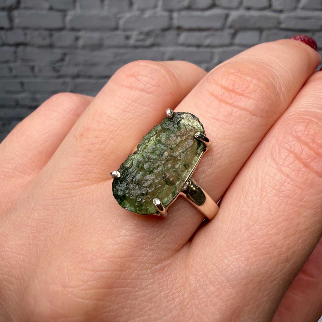 A gyűrű egyedi és ritka darab, hiszen a Moldavit rendkívül ritka, természetes üvegszerű ásvány, amely több mint 15 millió évvel ezelőtt keletkezett meteoritbecsapódás nyomán.