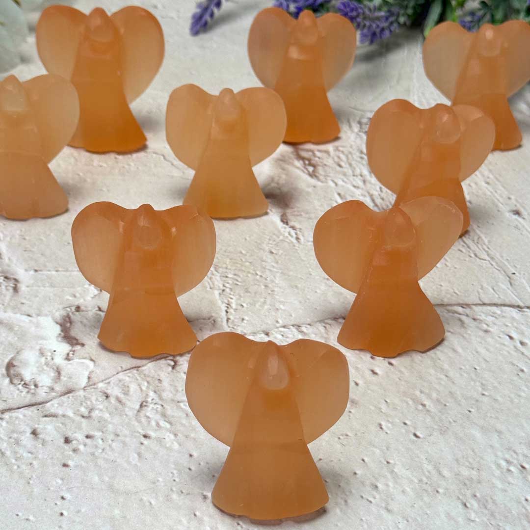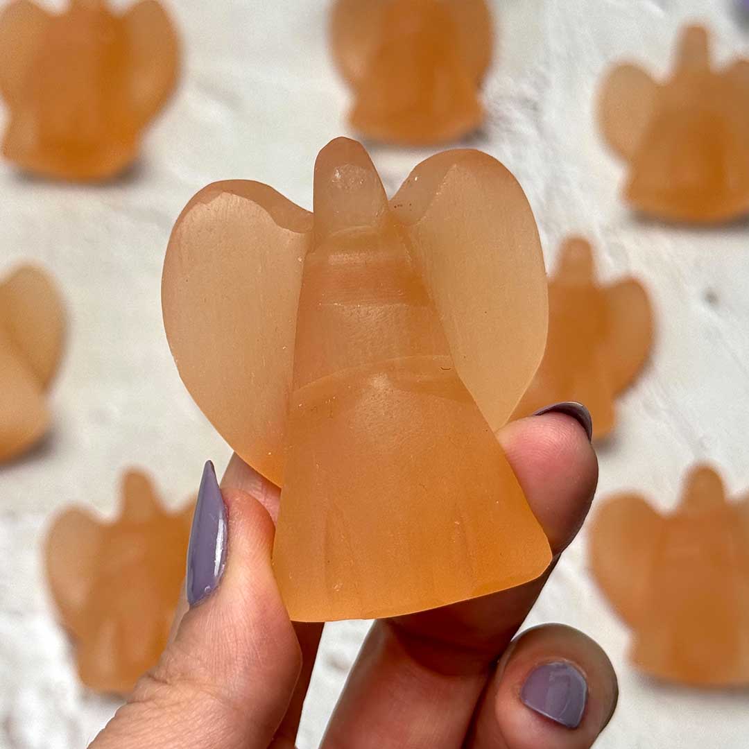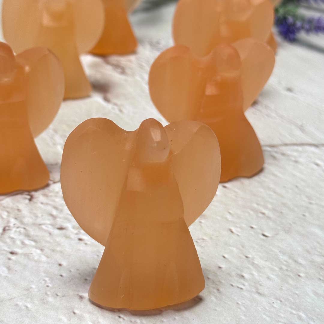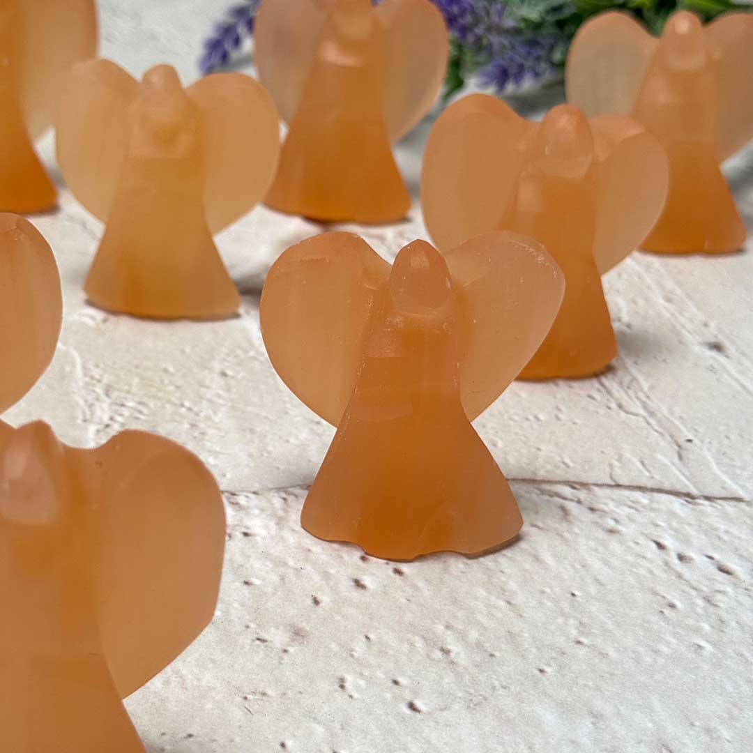 Ezek a kis méretű angyal faragványok különleges, világosnarancs árnyalatú szelenitből készülnek, melynek színe teljesen természetes. A szelenit a gipsz ásvány egyik változata, amely selymes fényével és finom rétegződésével könnyen felismerhető. A narancs szelenit az angyali energiák egyik legerősebb közvetítője.