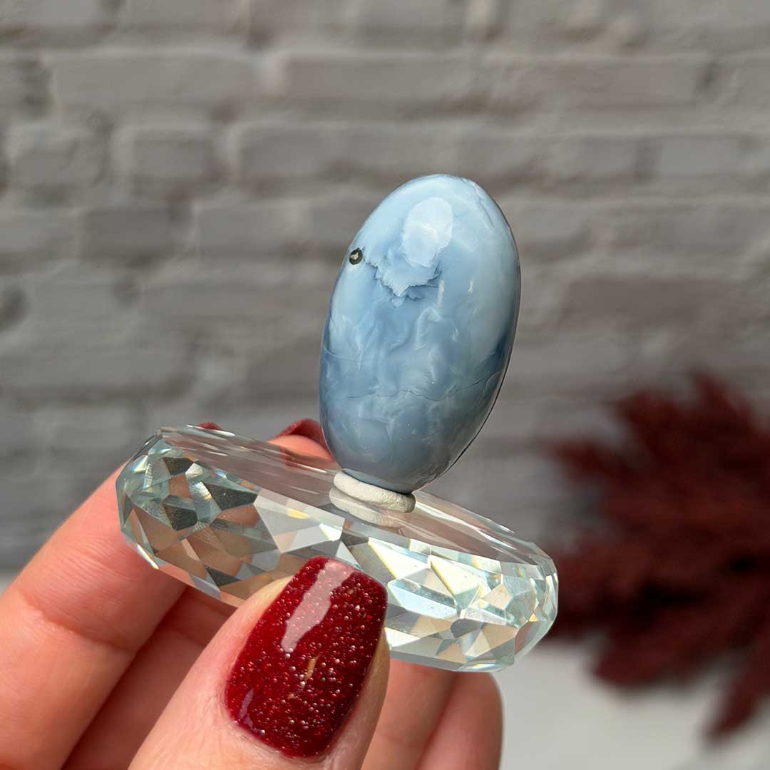 A természet és a szellemvilág találkozása – ez a Owyhee Kék Opál shiva az Oregonban található ősi Owyhee-forrás területéről származik, amely történelmileg különleges spirituális jelentőséggel bír. Az opál amorf ásványi anyag, mikrokristályos szilícium-dioxidból áll, magas víztartalommal, és a víz nyugalmát, csendjét idézi. Ez a darab álomszép, sávos mintázatú, mely minden fényben más árnyalatban ragyog, így igazán látványos, különleges energiát sugárzó ásvány. Állványt nem tartalmaz