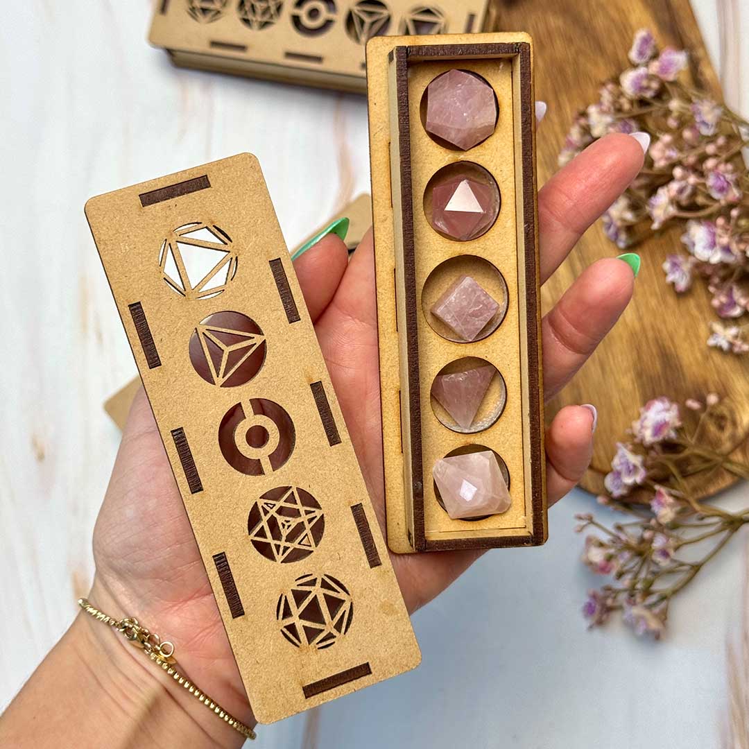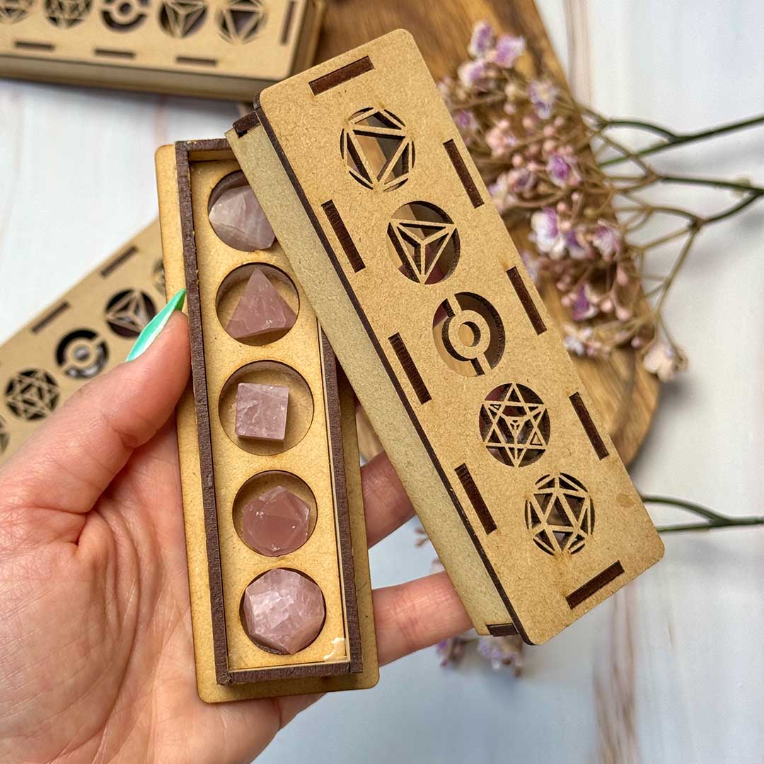 Platóni geometriai testek! Rózsakvarc (szettben, díszdobozban)