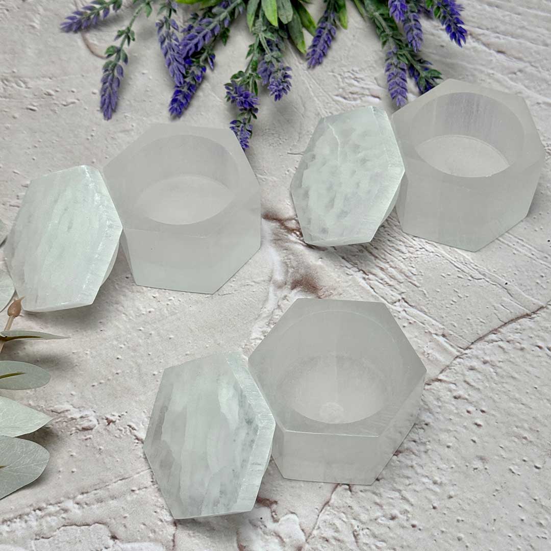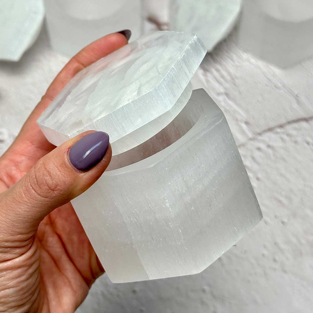 Ez a hatszögletű szelenit doboz harmonikus formájával és ragyogó megjelenésével elegáns kiegészítő. A szelenit a gipsz egyik kristályos változata, amely a tisztaság és a harmónia jelképe. Spirituálisan támogatja az önazonos női energia kibontakozását. A doboz kiválóan alkalmas kisebb kristályok, gyűrűk vagy fülbevalók tárolására.