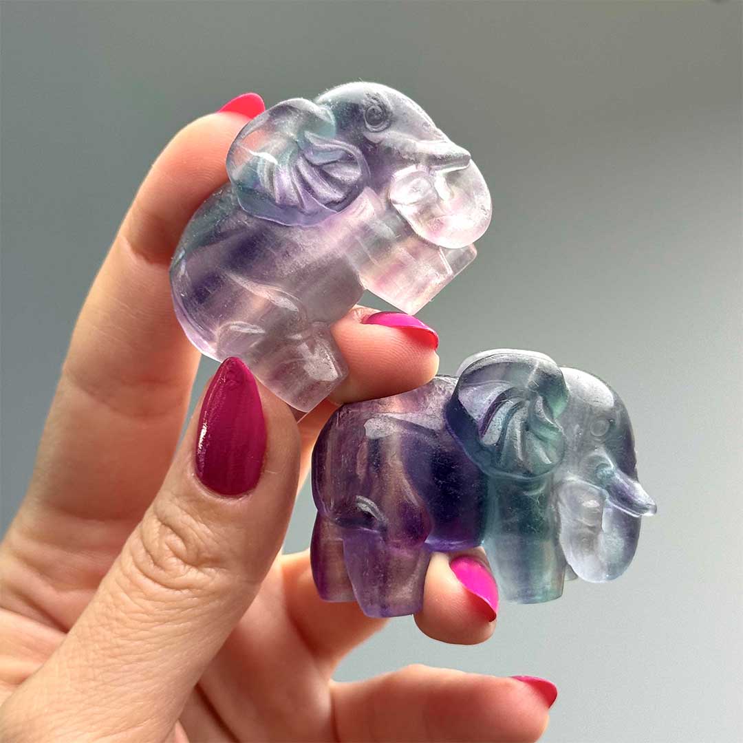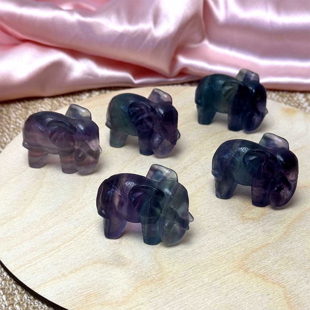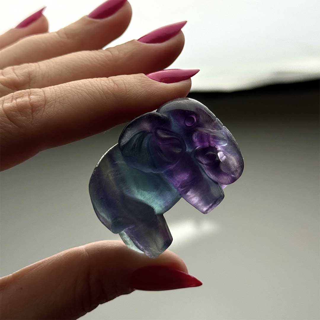 Ezek a gyönyörű, Szivárvány Fluoritból faragott Elefántok India ikonikus jelképeiként hátukon díszszőnyeket viselnek, melynek még mintájuk is kivehető a faragványokon.