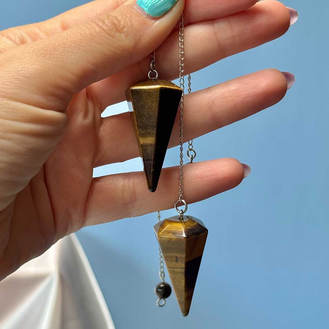 Az ingát egy kis tigrisszem gyöngy koronázza meg a lánc végén, amely nemcsak esztétikai szempontból harmonikus, hanem megerősíti az inga hatását is.