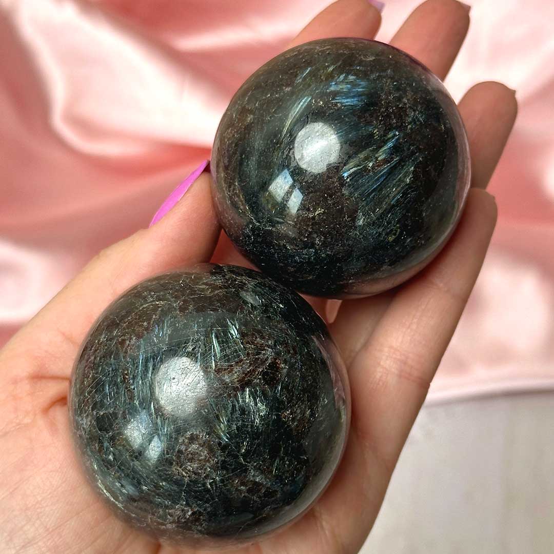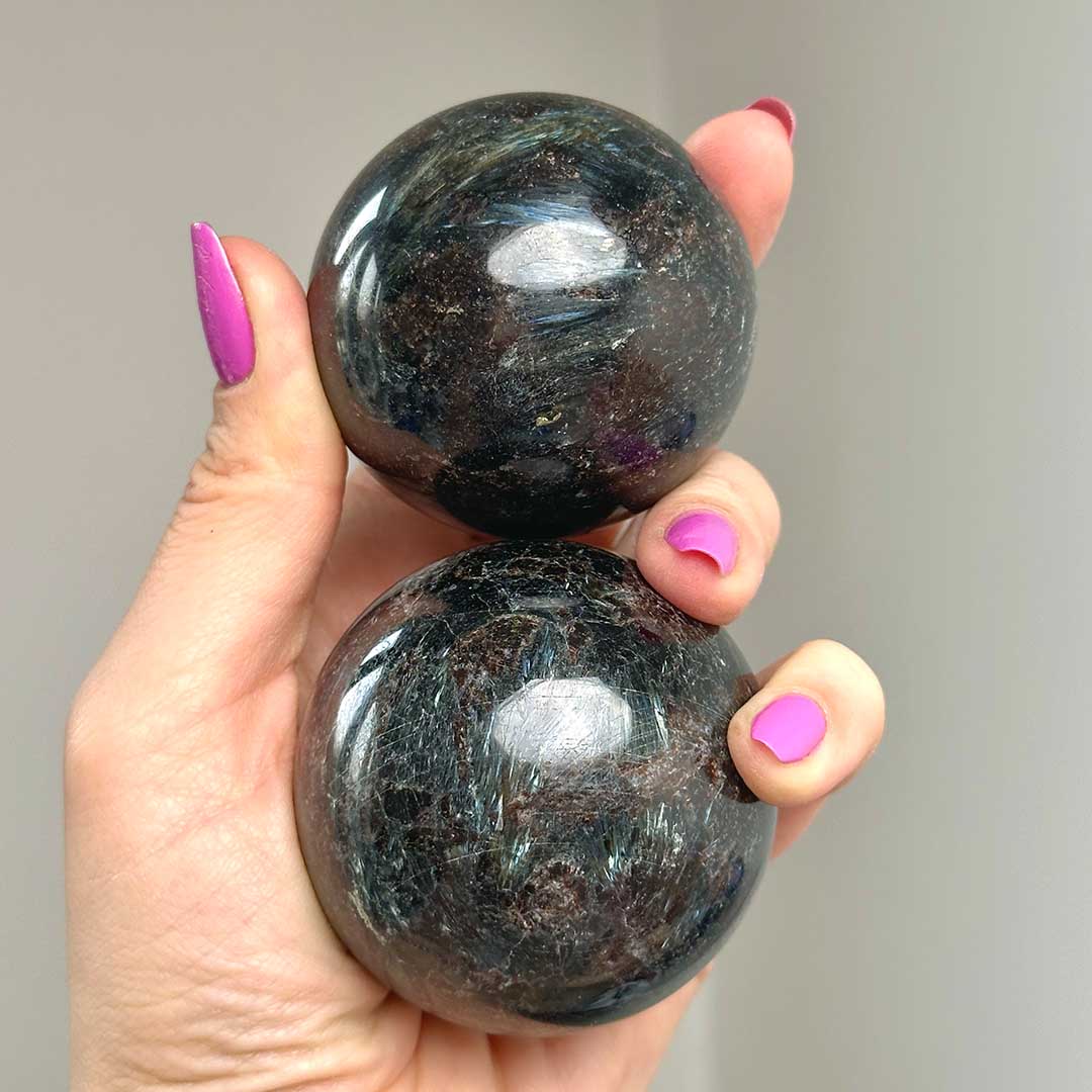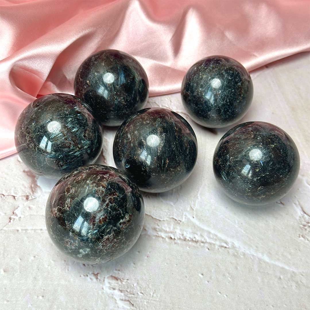 Kéken fénylő Asztrofillit gömbjeink érkeztek! Nagyon mutatós, fekete alapon mintázott gömbök melyeknek kék színű, sugarakban csillanó fények mutatkoznak meg, tűs-szálas mintázatban! Ezen túl néhol vöröslő foltok is megfigyelhetőek rajtuk, ezek gránát zárványok. Csodás darabok!