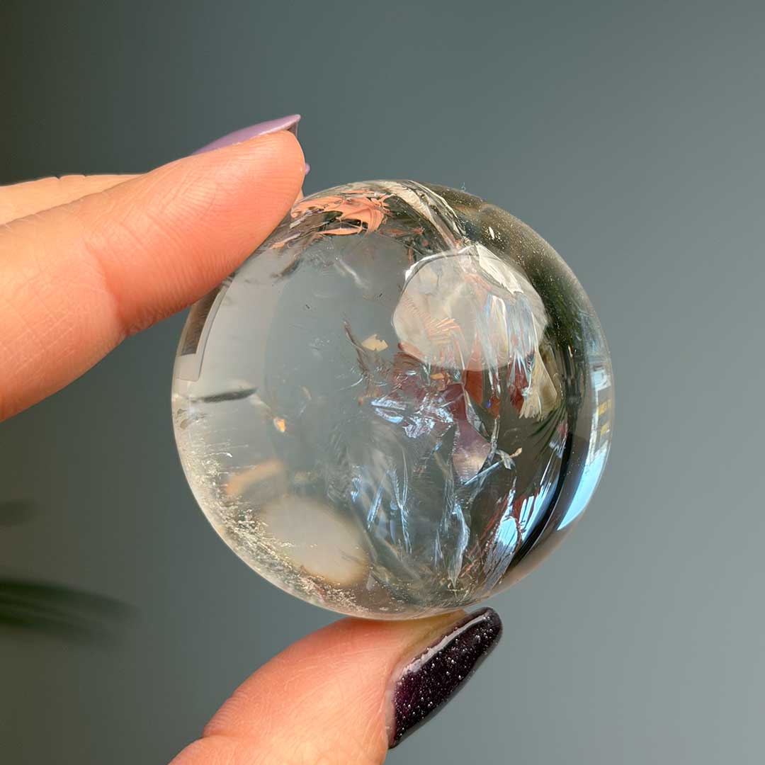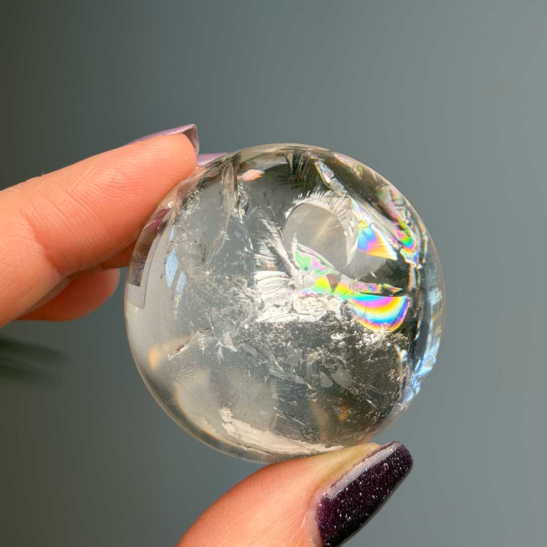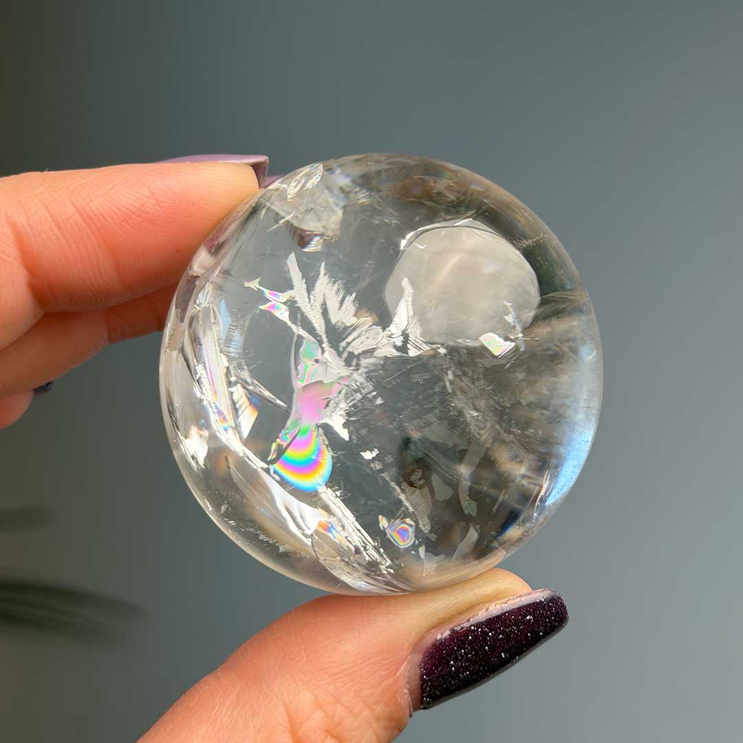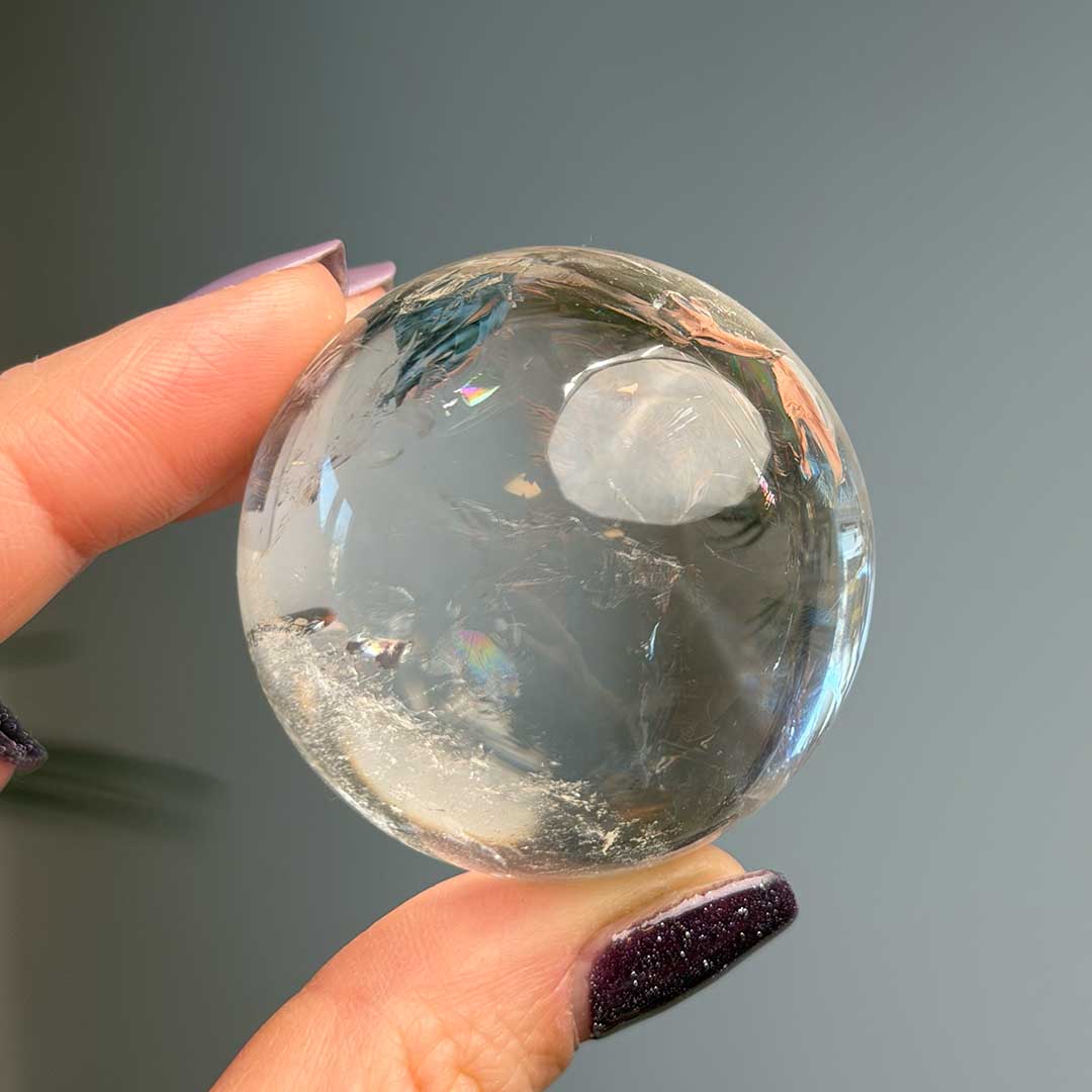 Ez a hegyikristály gömb Brazíliából származik, rendkívül tiszta, magas minőségű kristályból készült. Különlegességét az óriási szivárvány adja, ami ritkán fordul elő ekkora tisztaság mellett, így igazán értékes darab. A gömb energiája tiszta és magas rezgésű, miközben kiemeli a kristály természetes fényjátékaiban rejlő szépséget.