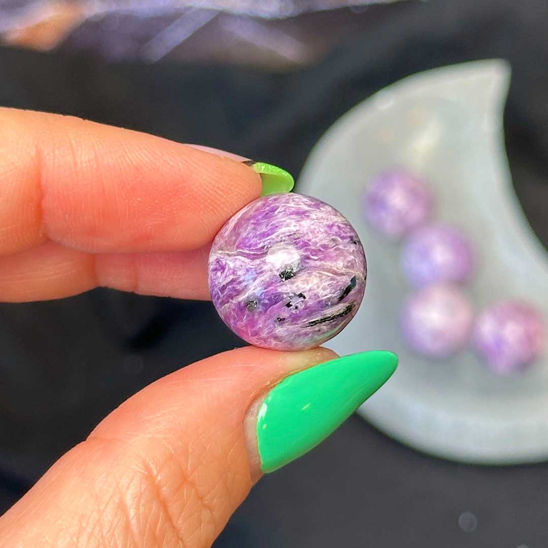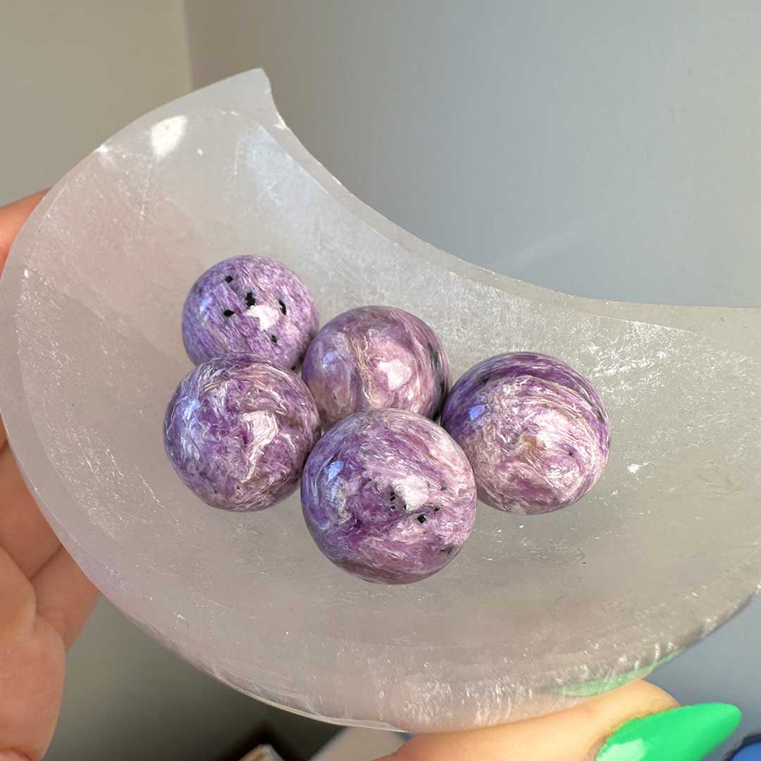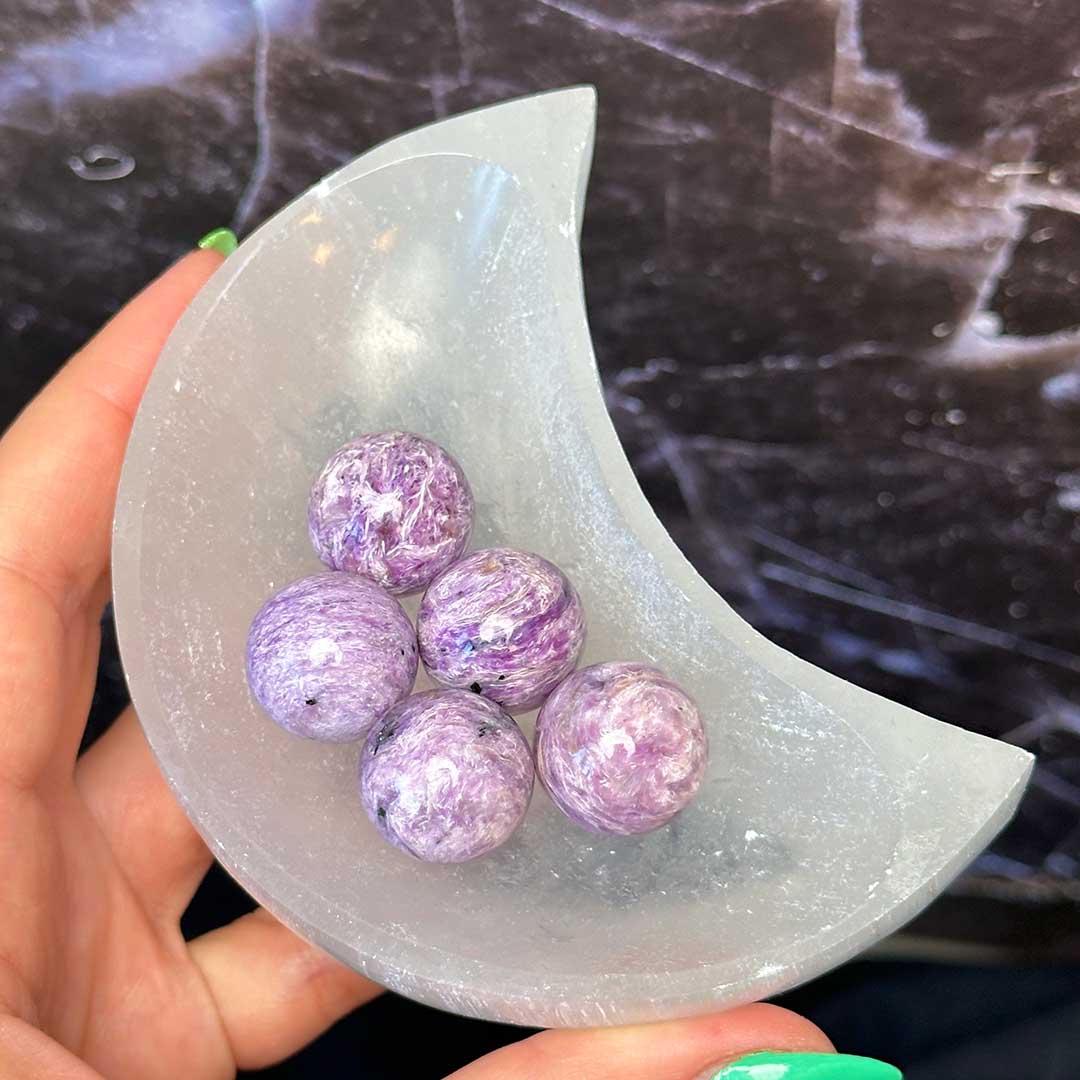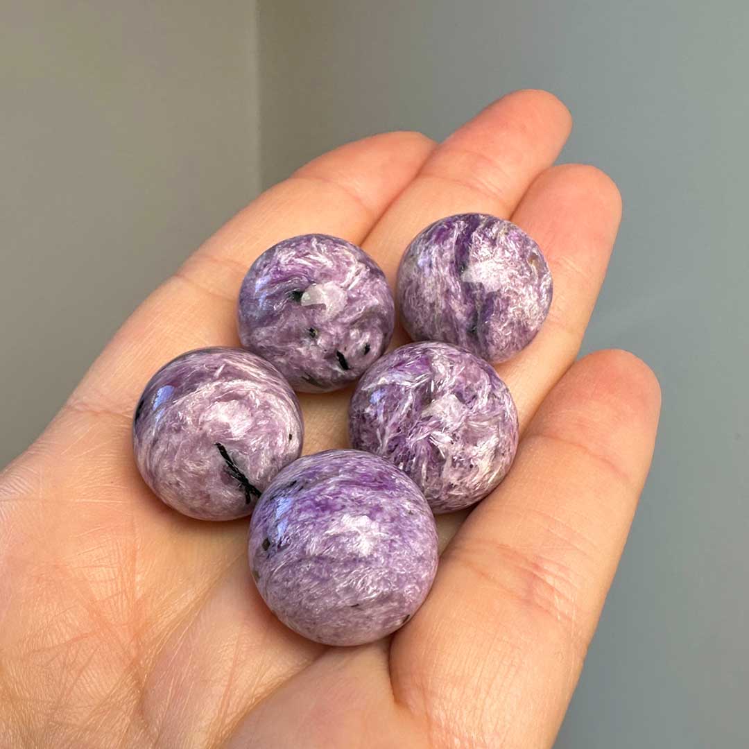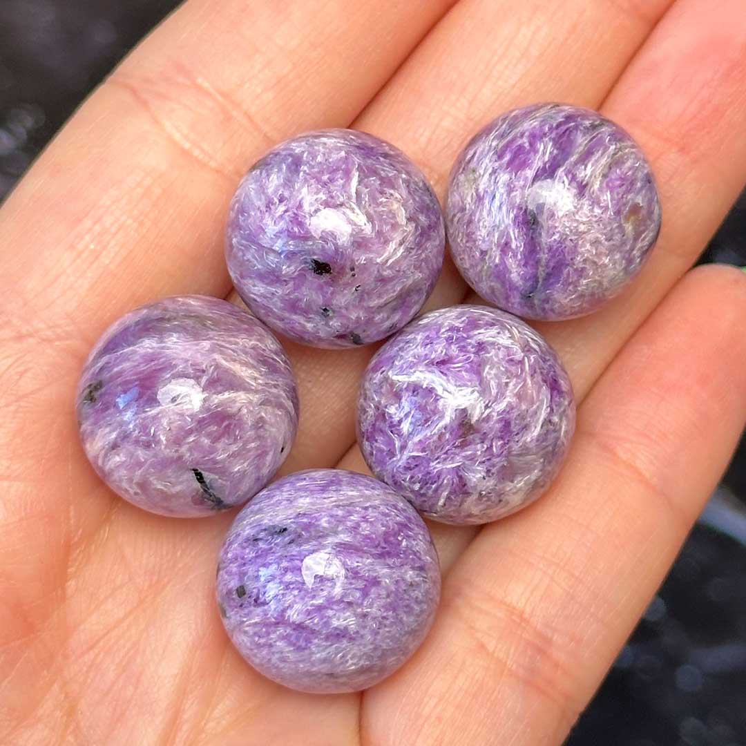 Sikerült szereznünk ebből a különleges ásványból, mely Oroszországból származik és Csaroit nevet viseli. Ritka, a világon csak egy helyen található - Szibériában. Ez a természetesen élénk lila színű, csillogó levendulaszínű örvényekkel teli kő néha fekete aegirin zárványokat is tartalmaz, ezek a darabok viszont szinte teljesen lilák, gyönyörű minőségű golyók. Ha régóta keresel gyűjteményedbe, itt a tökéletes alkalom!