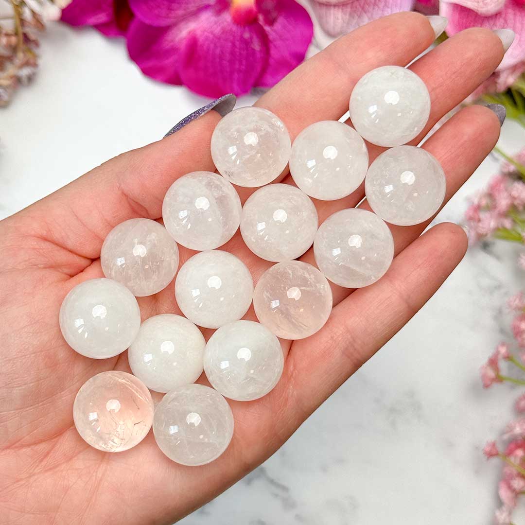 Teli, helyenként átlátszó fehér színű hegyikristály mini golyók