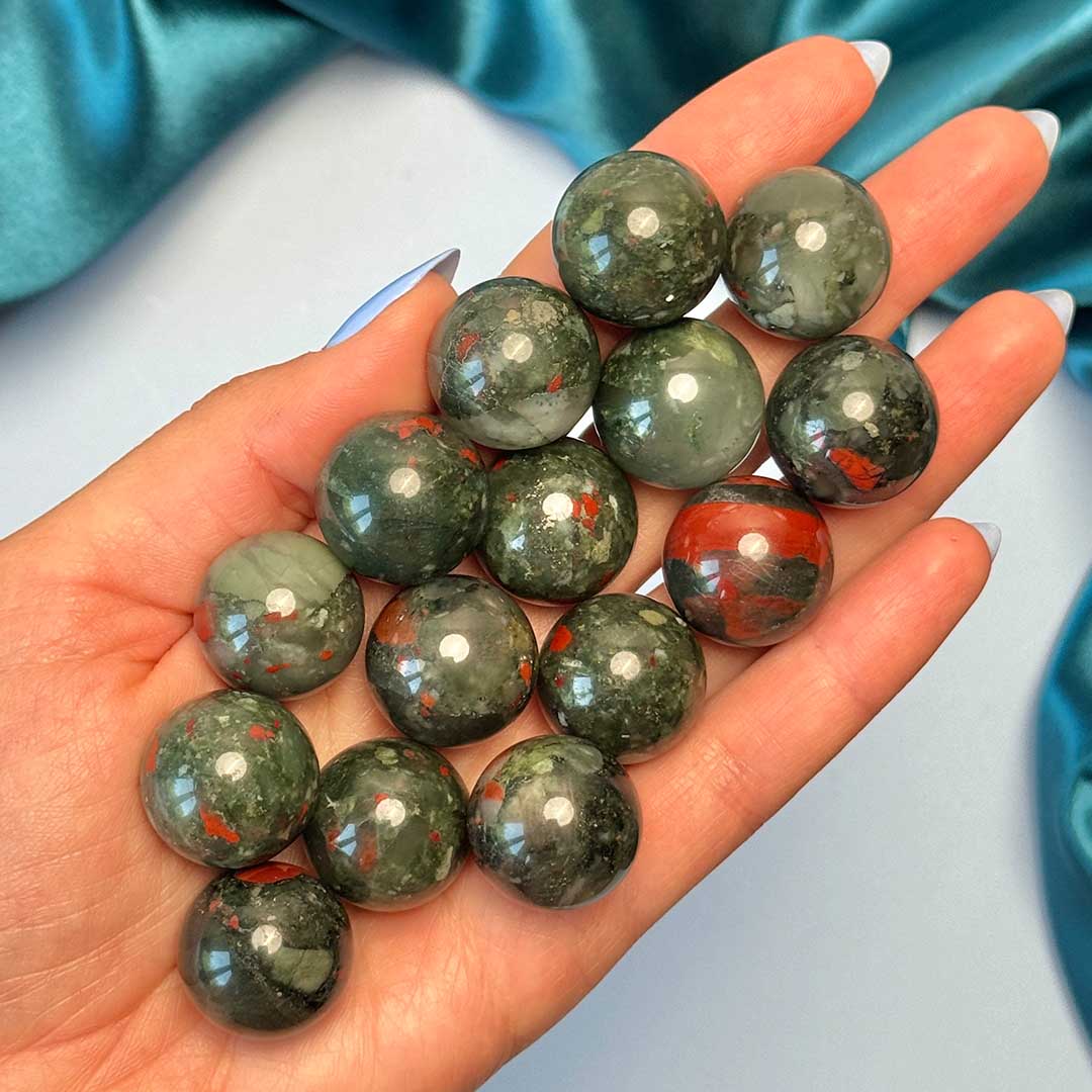 Heliotróp vérkő golyók, melyek alapvetően szürke felületén cseppekként csillannak meg a vöröslő vérkő foltok.