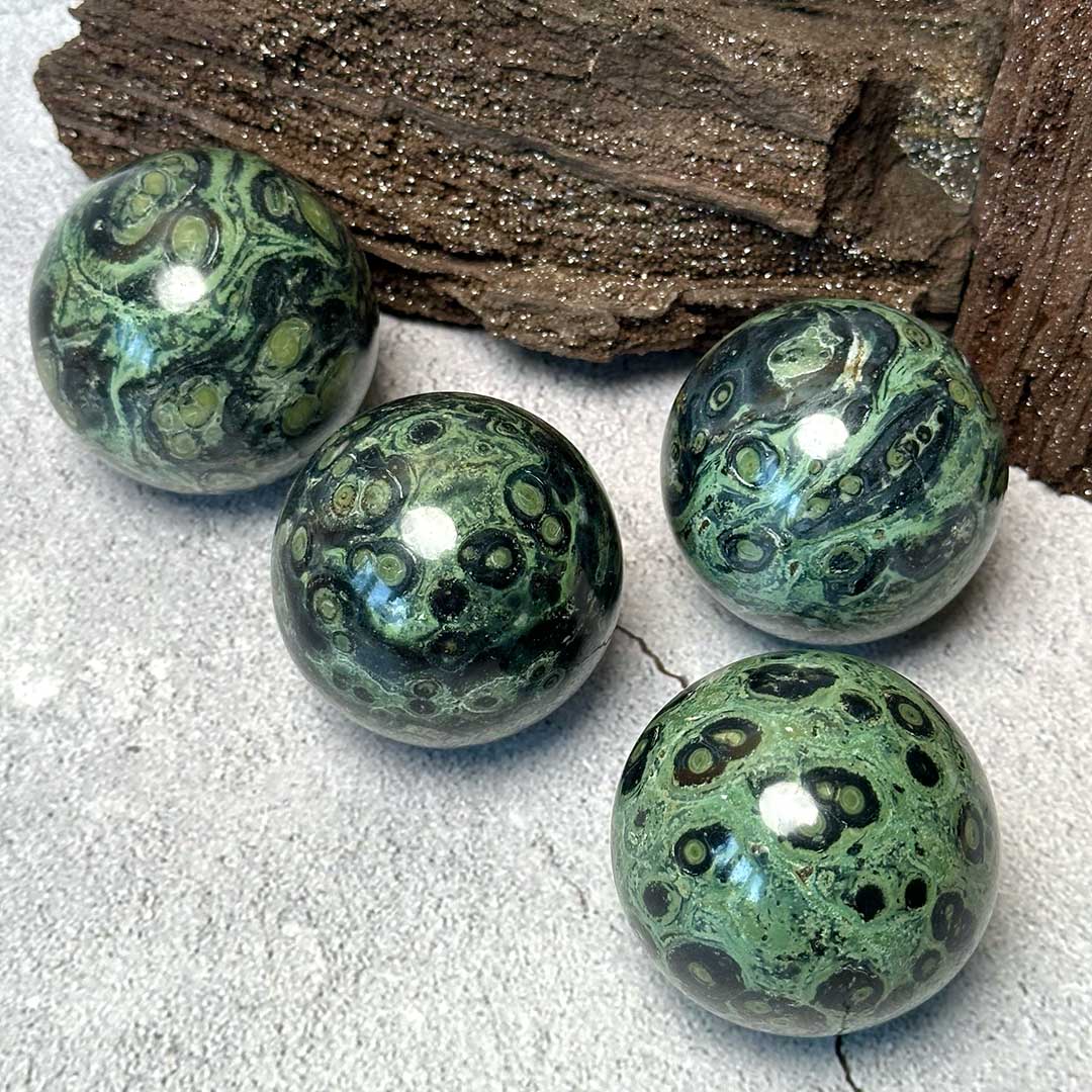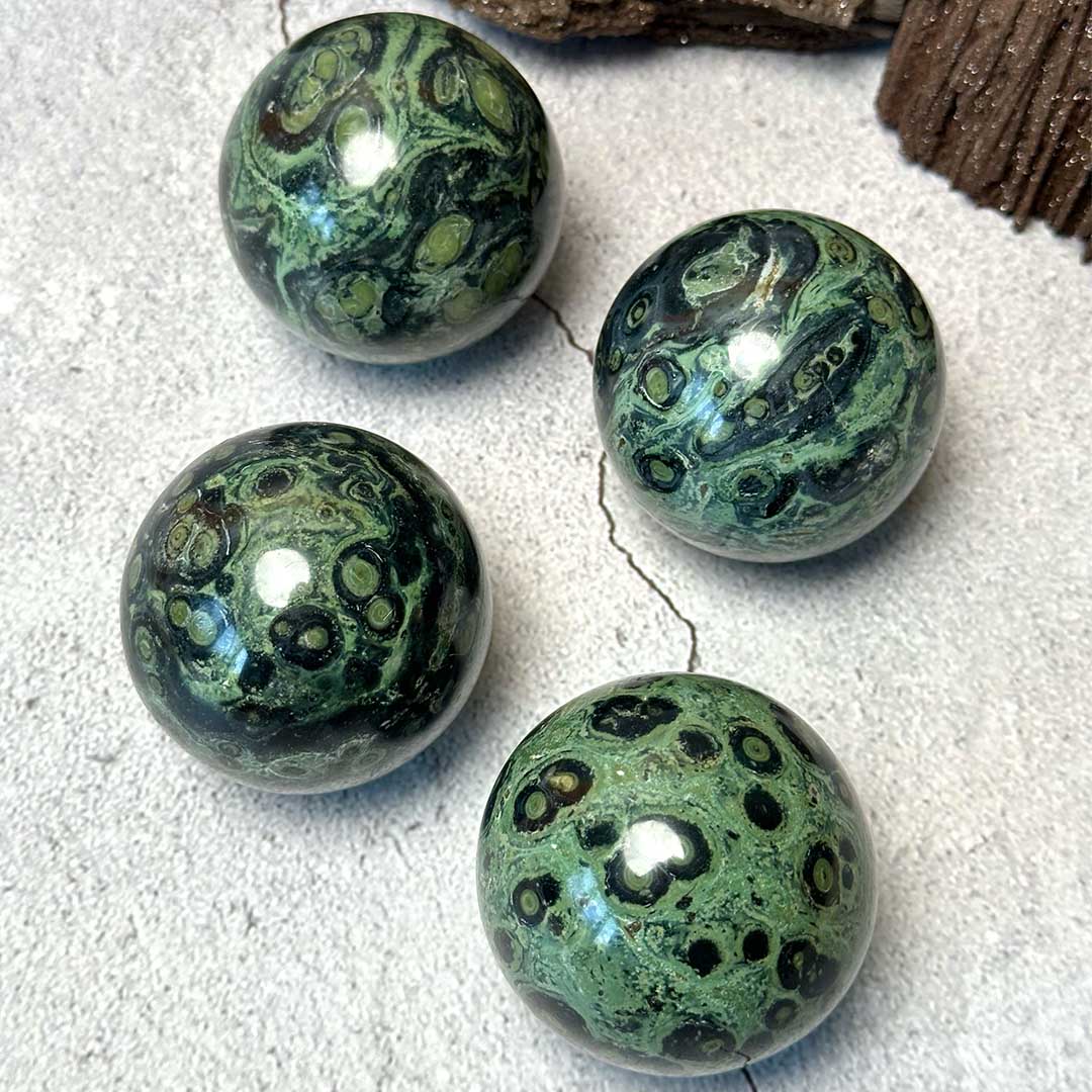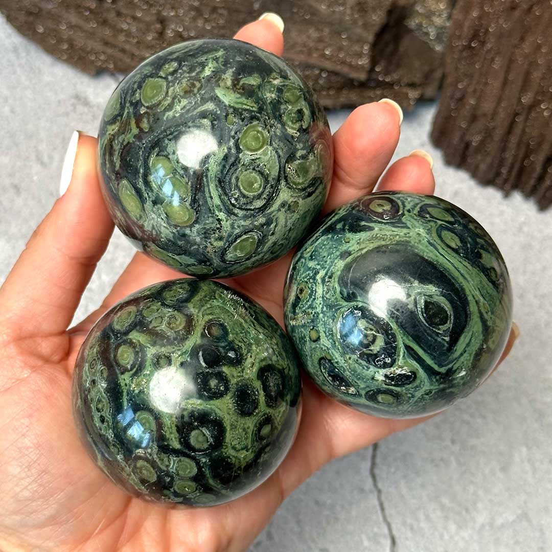 A Kambaba jáspis gömb lenyűgöző, mélyzöld és fekete örvénylő mintázatáról ismert, darabjai több mint 2 milliárd évesek. Ez a mikrokristályos kvarc szerkezetű ásvány rendkívüli tartóssággal és természetes mintázatával minden darabot egyedivé tesz. A hagyományos hiedelmek szerint a Kambaba jáspis a földelés, a nyugalom és az érzelmi stabilitás köve, segítve a belső béke megteremtését. Sima, gömb formája esztétikailag harmonikus és az energiák egyenletes áramlását jelképezi.