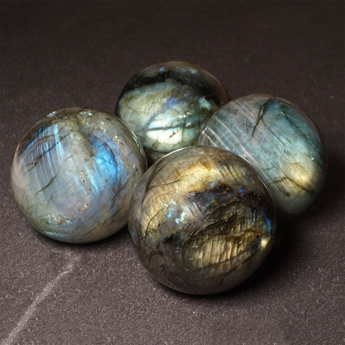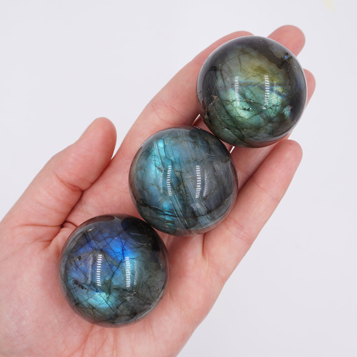 A választott köveket véletlenszerűen választjuk ki. A Labradorit golyók átmérője kb. 4 cm, és igyekszünk minél fényesebbet választani neked!
