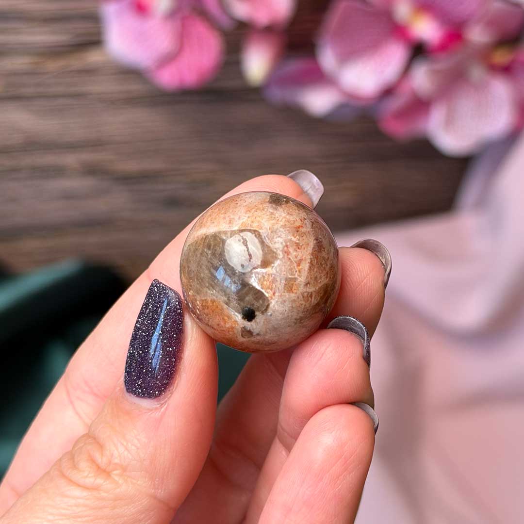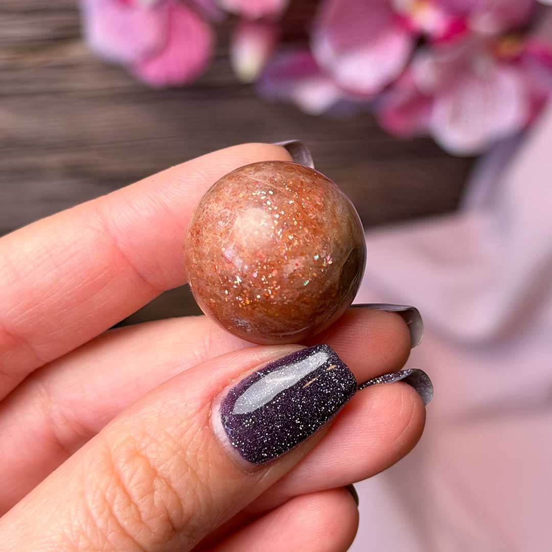 Szikrázó Napkő golyók! Ezek az Indiai csiszolatok a napkő intenzív csillogását hordozzák, narancs összhatású, de közelebbről megnézve szivárványszínű csillámokkal.