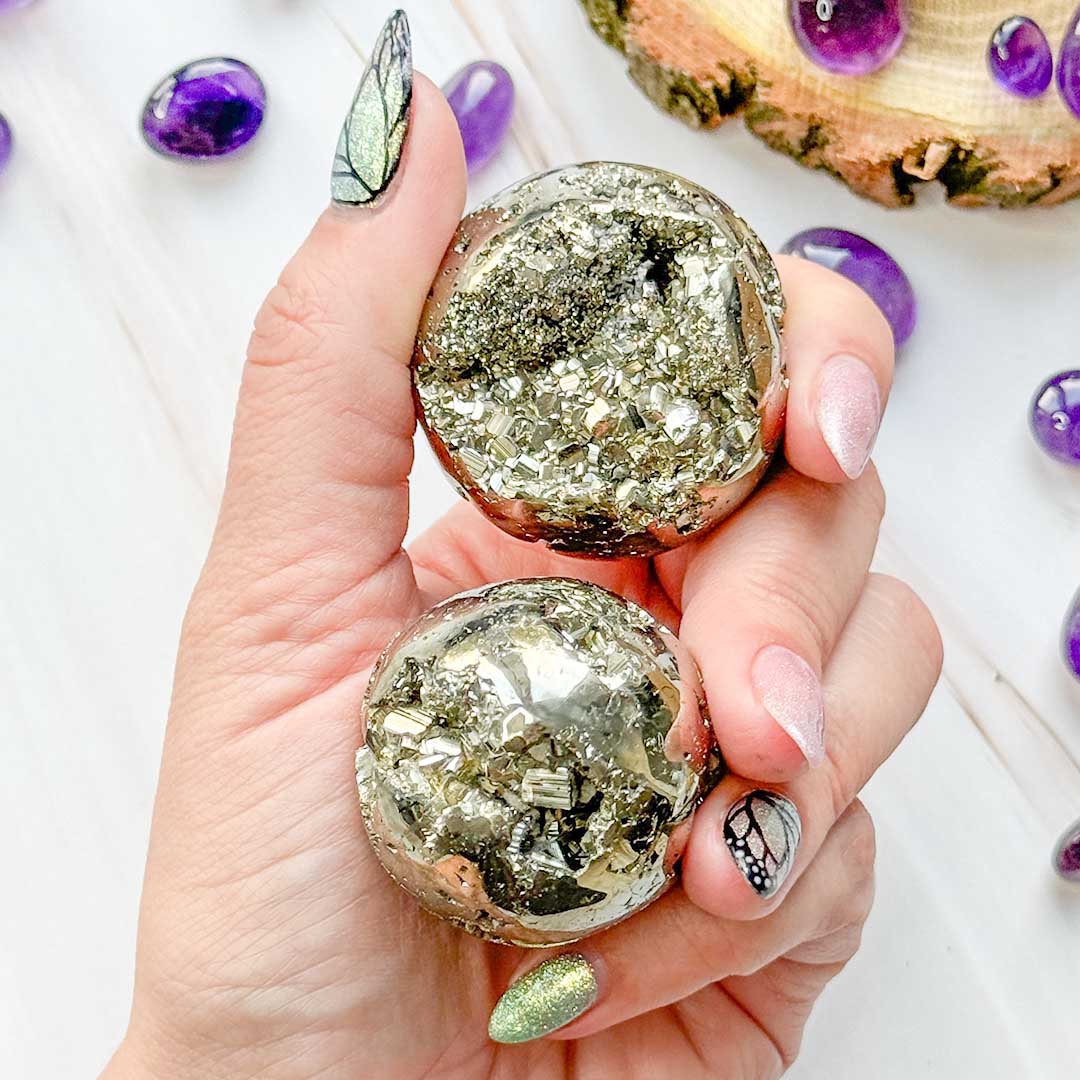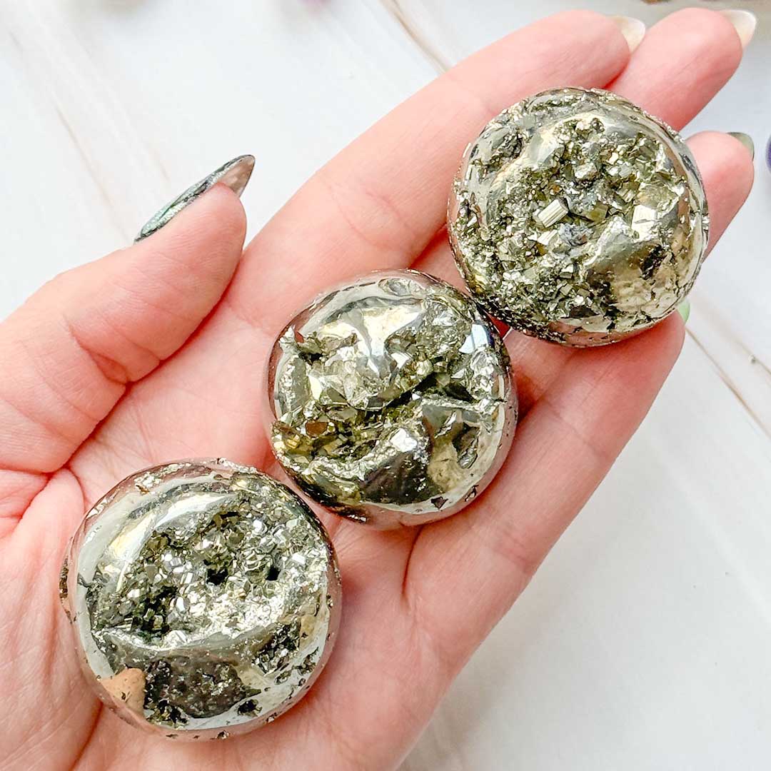 Gyönyörű, természetes pirit geóda golyók! Mesés pirit golyók, kristálybarlangos geódák! Szuper mutatós darabok, igazi kis félig csiszolt-félig nyers kincsek!