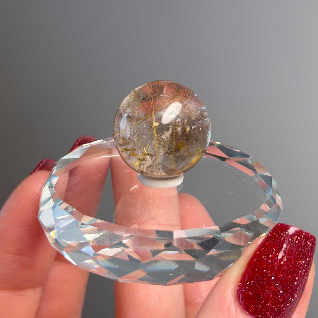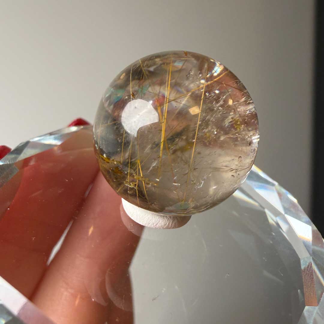 Ez a Rutilkvarc golyó meseszerű megjelenésű, arany és rezes színű rutiltűkkel tűzdelt darab. Magas minőségű, tiszta ásvány, amelyben a rutiltűk jól kivehetők, és a fényben gyönyörűen csillognak. Finoman csiszolt, sima felülete elegánsan mutat, így dekorációként vagy gyűjteménybe illesztve is különleges darab. Állványt nem tartalmaz