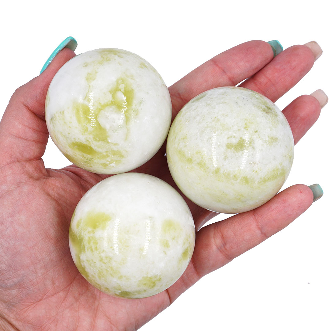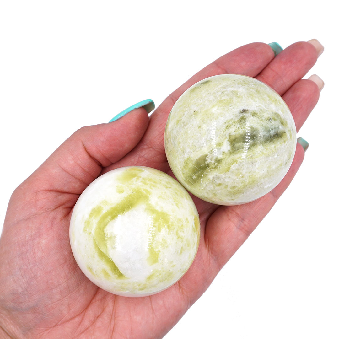 Különleges fehér-sárgás-zöldes színben pompázó Xiu Yu Jáde golyó.