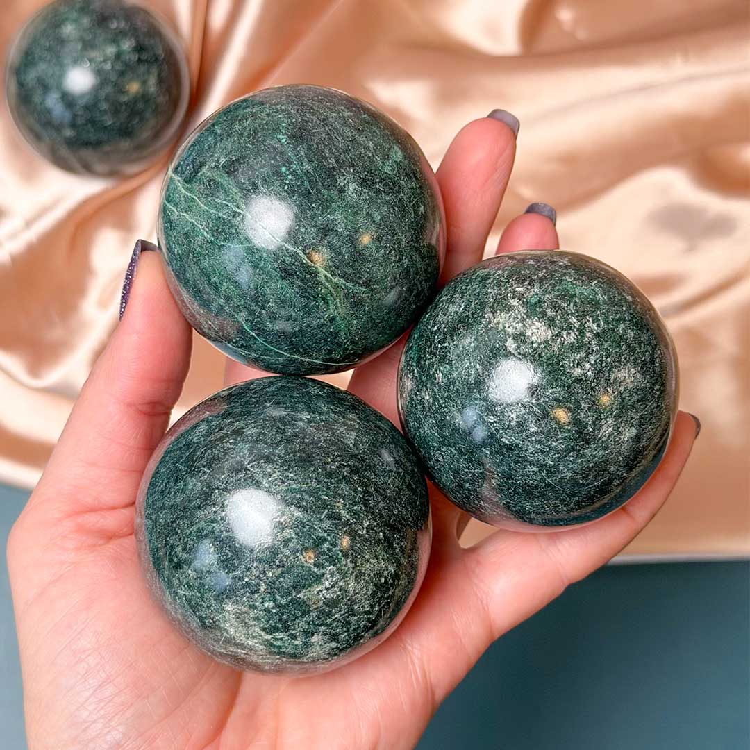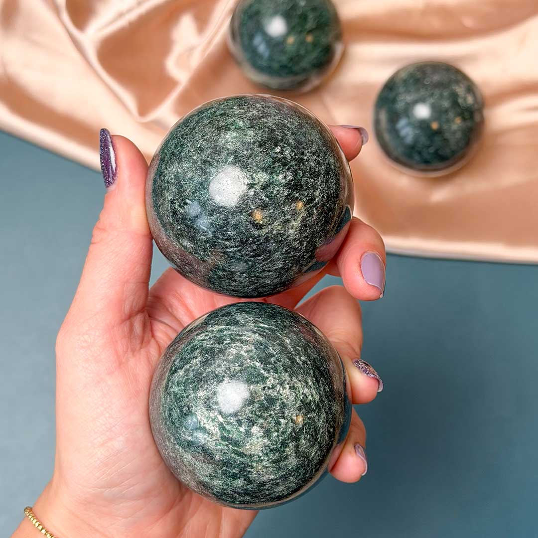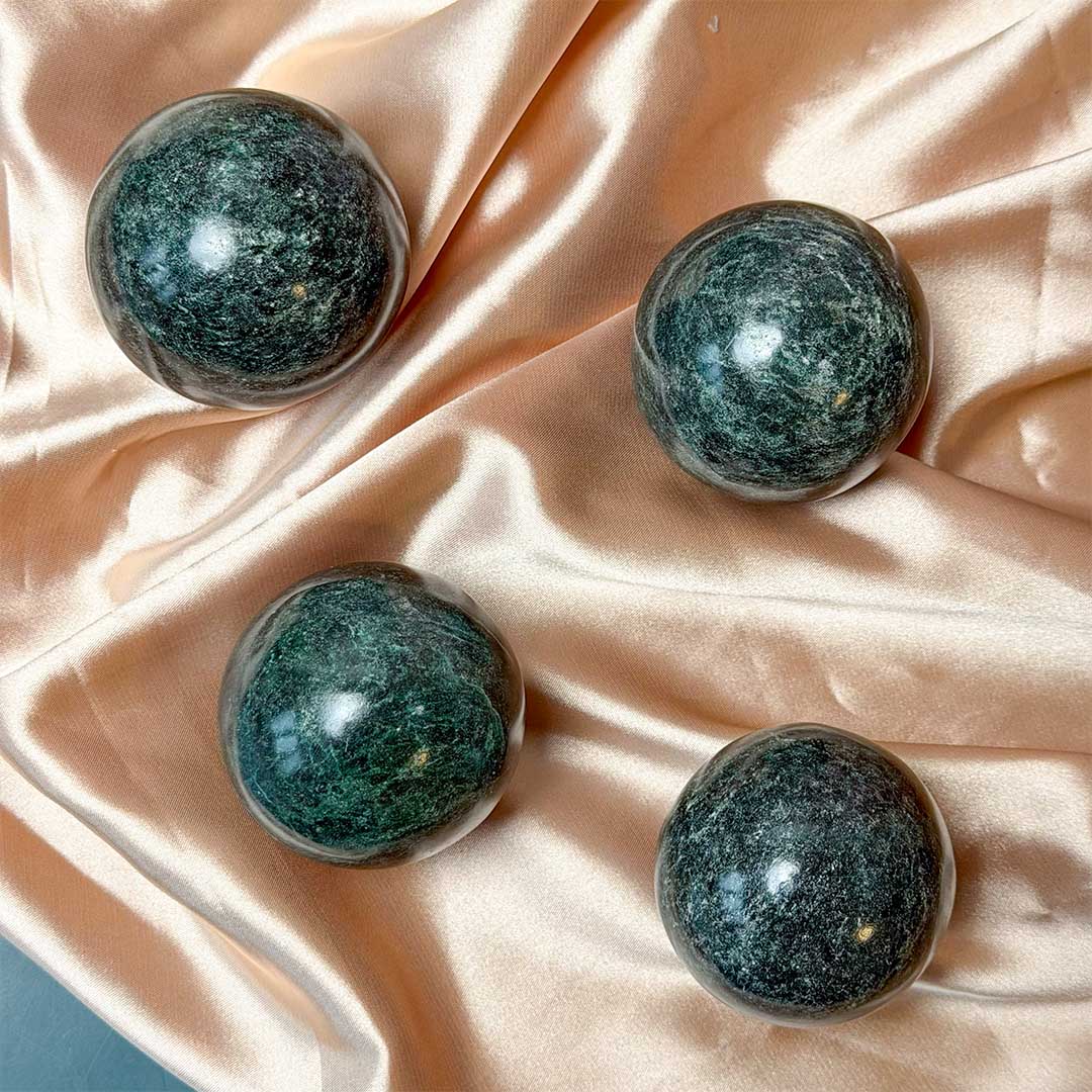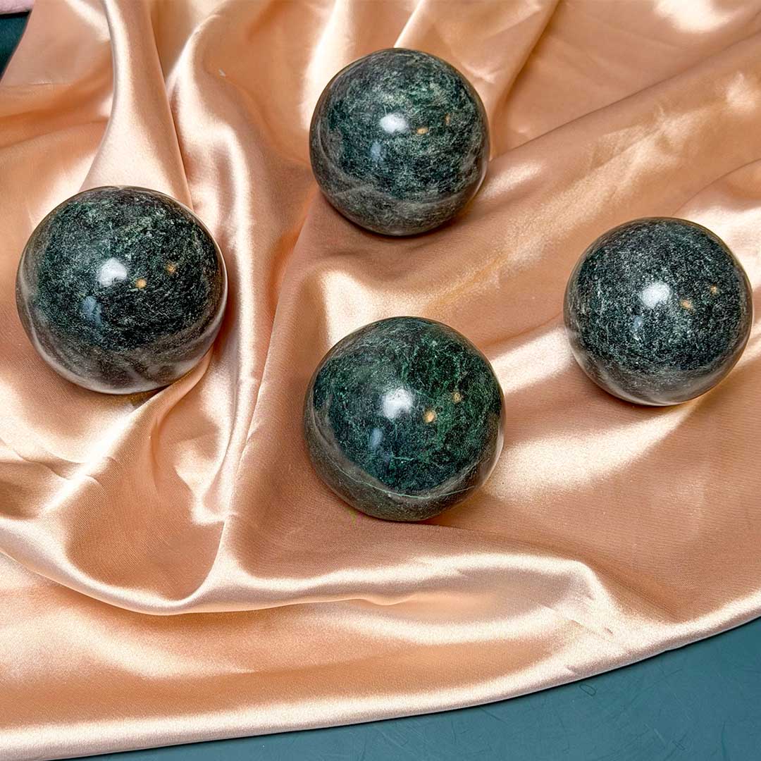 Gyönyörű, mélyzöld, micás csillogású Zöld kianit gömbök! A ritkán beszerezhető Zöld Kianitból gömböket is hoztunk a kínálatba, melyek kifejezetten mély színű, szikrázó darabok (kb 5,6 cm-esek!)
